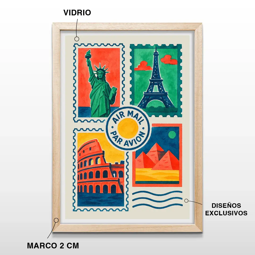 Este cuadro decorativo Estampillas Viaje reúne algunos de los destinos más emblemáticos del mundo en una composición inspirada en las clásicas estampillas de correo aéreo. Las siluetas de la Estatua de la Libertad, la Torre Eiffel, el Coliseo y las Pirámides de Egipto conviven en un diseño de estética vintage que evoca movimiento, historia y espíritu viajero.