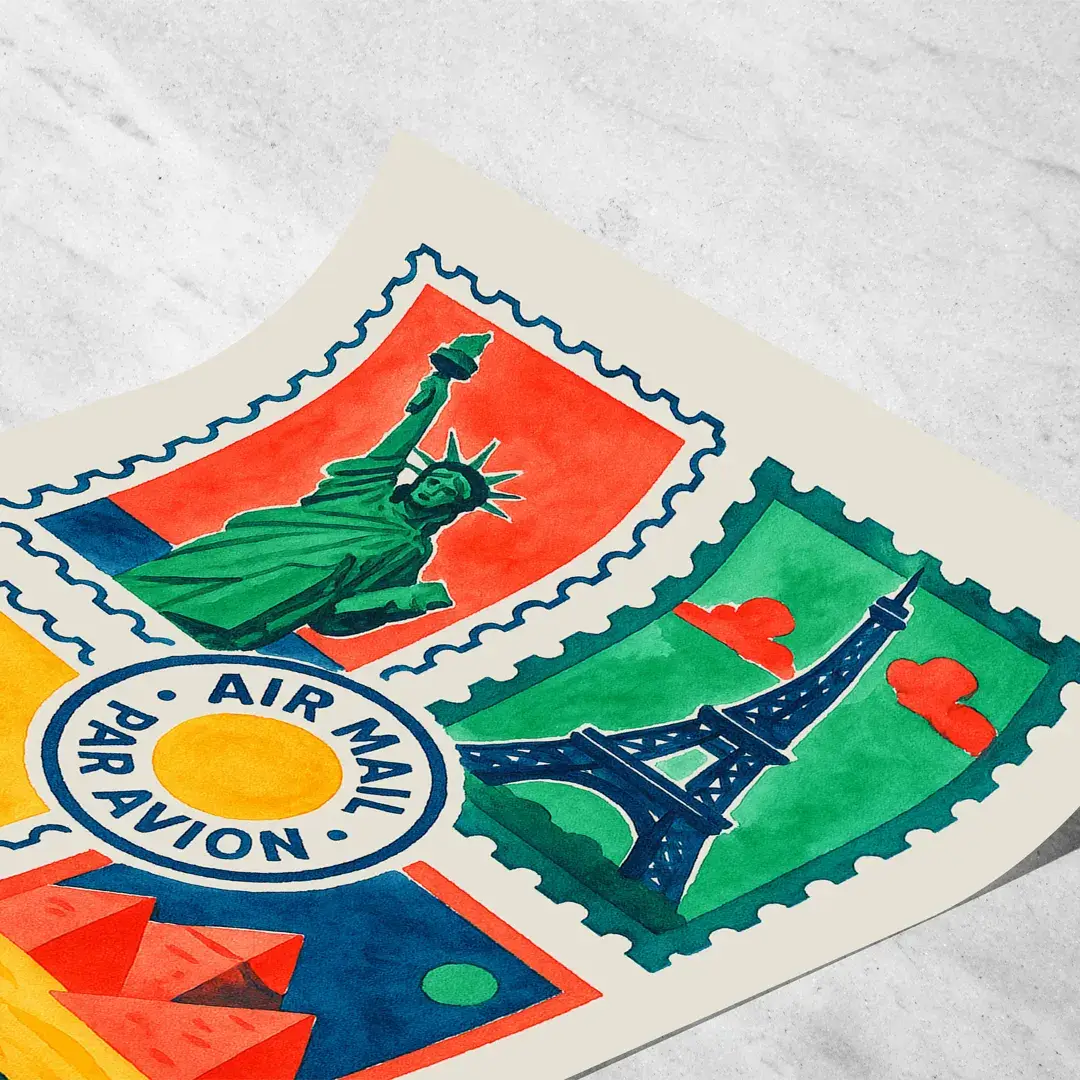 Una pieza pensada como recuerdo gráfico de los grandes viajes. La ilustración combina iconos arquitectónicos internacionales con una narrativa nostálgica, convirtiendo cada sello en una invitación a descubrir nuevos horizontes.