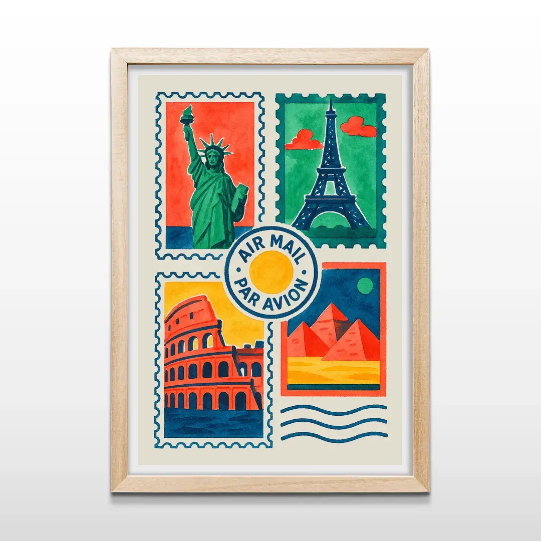 Una excelente opción para quienes buscan cuadros decorativos de viajes con estética vintage y narrativa visual. Este cuadro de estampillas y destinos icónicos funciona como wall art inspiracional, perfecto para amantes del turismo, la historia y la decoración con espíritu aventurero.
