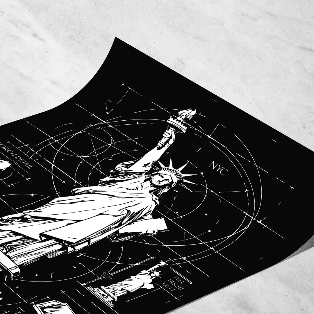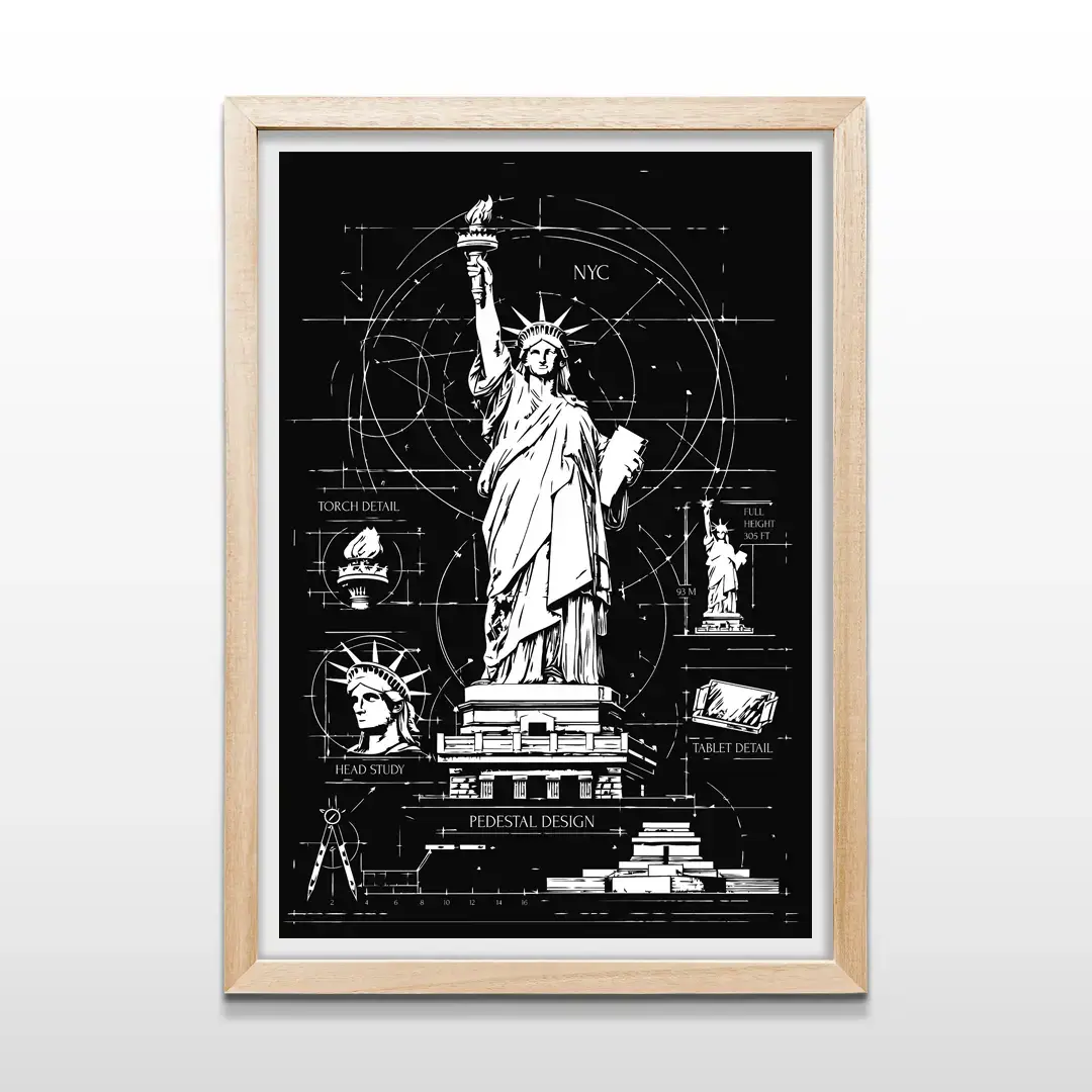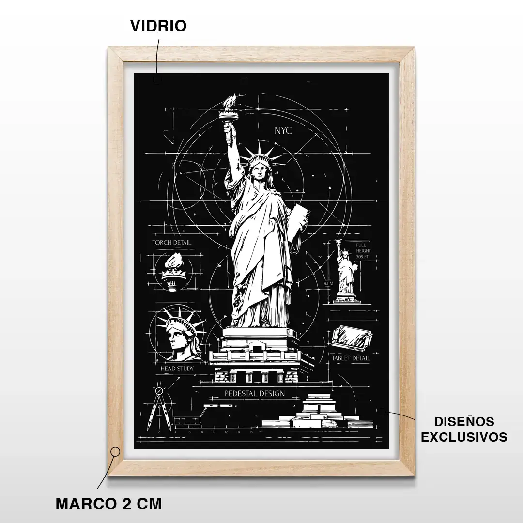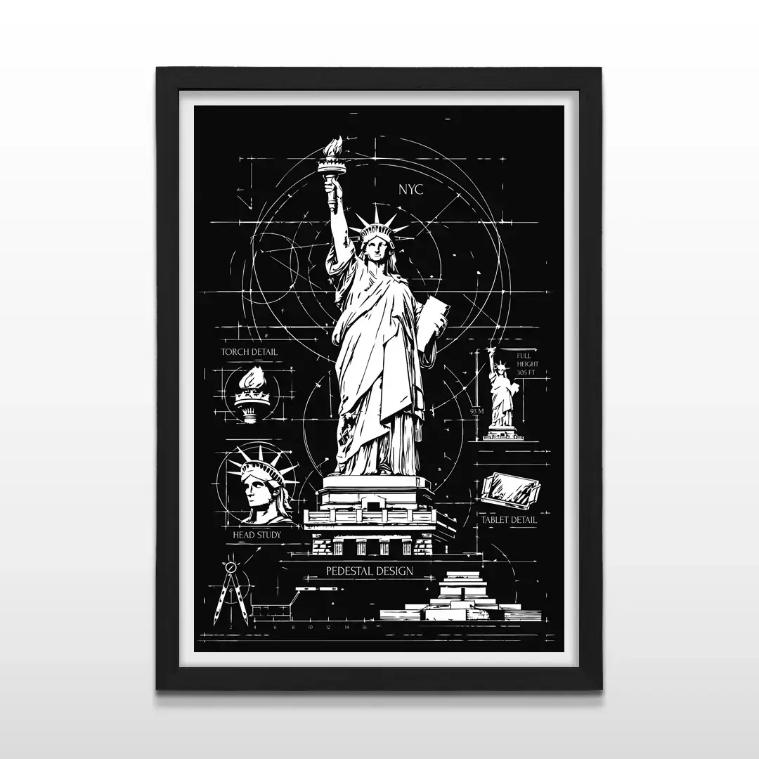 El cuadro decorativo Estatua de la Libertad Blueprint traduce uno de los símbolos más icónicos del mundo en un lenguaje técnico y racional, poniendo el foco en su arquitectura y concepción estructural. La obra presenta un desarrollo tipo plano técnico donde se detallan la antorcha, la corona, el pedestal y la estructura interna de la estatua mediante líneas blancas precisas sobre un fondo negro profundo, evocando archivos históricos de ingeniería y dibujo arquitectónico.