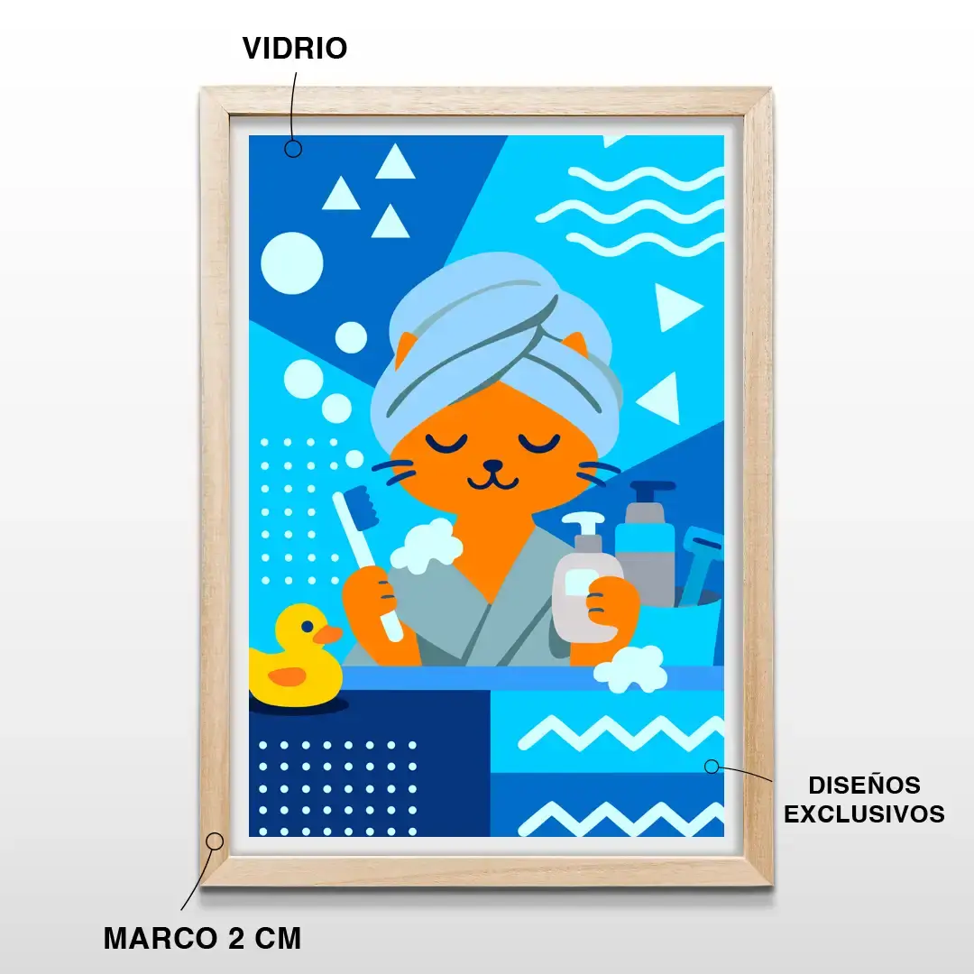 Pensado para quienes desean comprar cuadros decorativos de gatos en Argentina, este diseño se relaciona con búsquedas como cuadro gato spa decoración, lámina de gato divertido para baño, arte pop de gato naranja, cuadro ilustrado moderno de mascotas y decoración con gatos para el hogar.