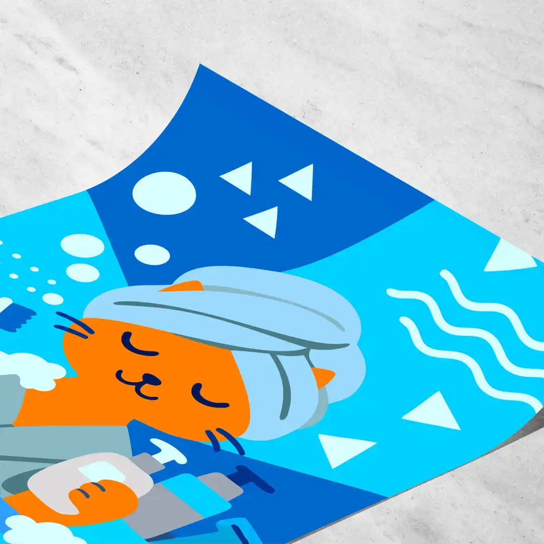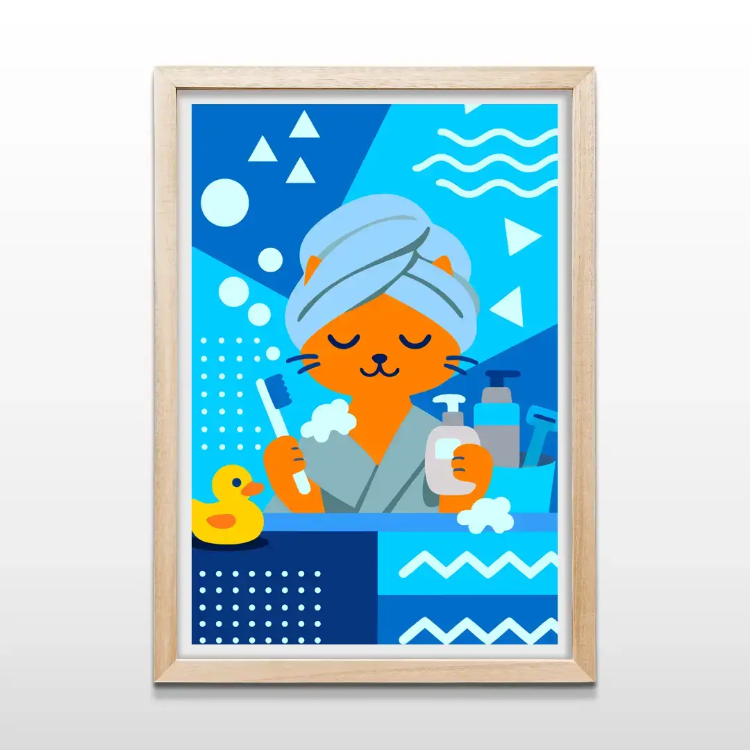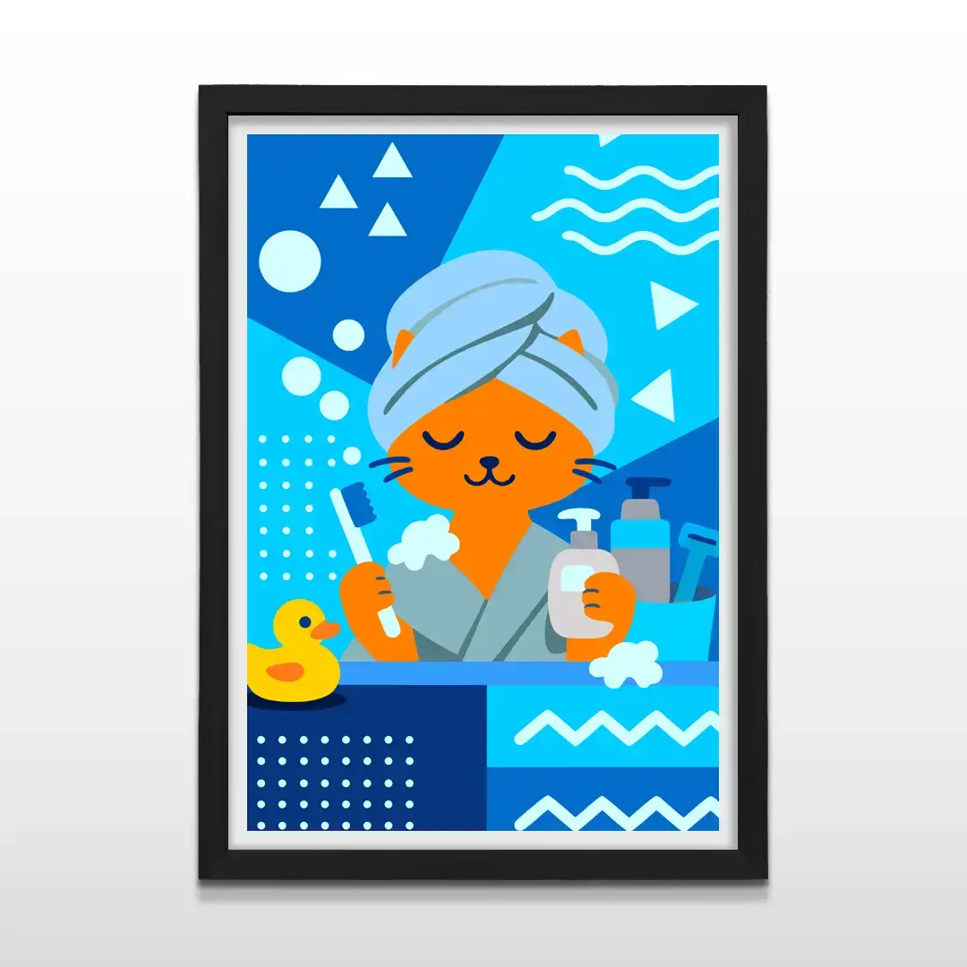 El cuadro decorativo Gato en Spa presenta una escena ilustrada llena de humor visual donde un gato naranja aparece en un momento de relajación, con turbante de toalla y accesorios de baño que refuerzan la temática de autocuidado. La composición utiliza una paleta de azules vibrantes y formas geométricas dinámicas que contrastan con el personaje central, generando una imagen fresca y divertida.