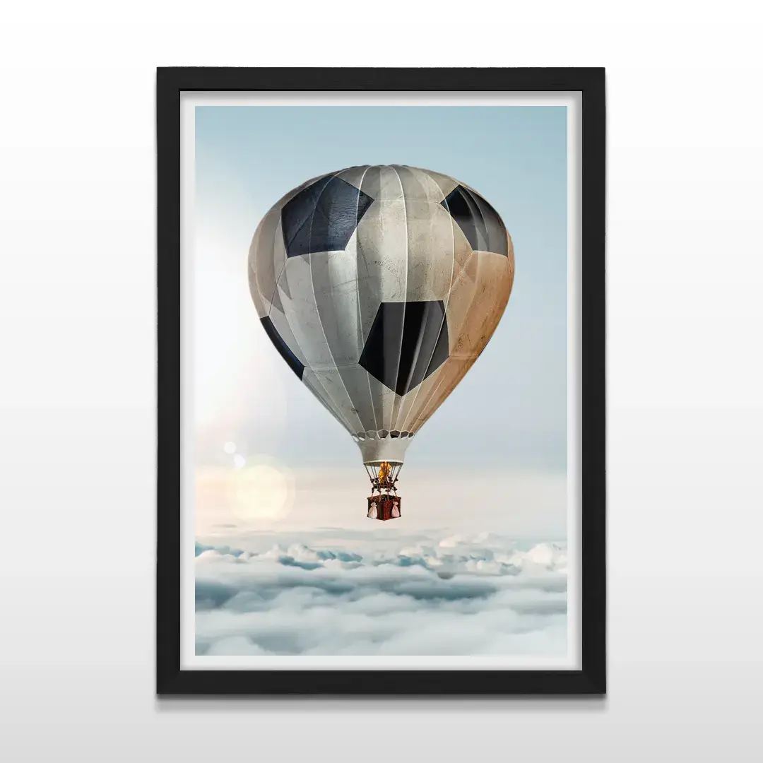 El cuadro decorativo Globo Aerostático es una pieza de arte surrealista contemporáneo que fusiona la imaginación con la pasión futbolera. La imagen presenta un globo aerostático construido con la textura y los gajos de una pelota de fútbol clásica, elevándose sobre un océano de nubes blancas bajo un cielo de atardecer cálido, generando una sensación de libertad, ilusión y conquista.