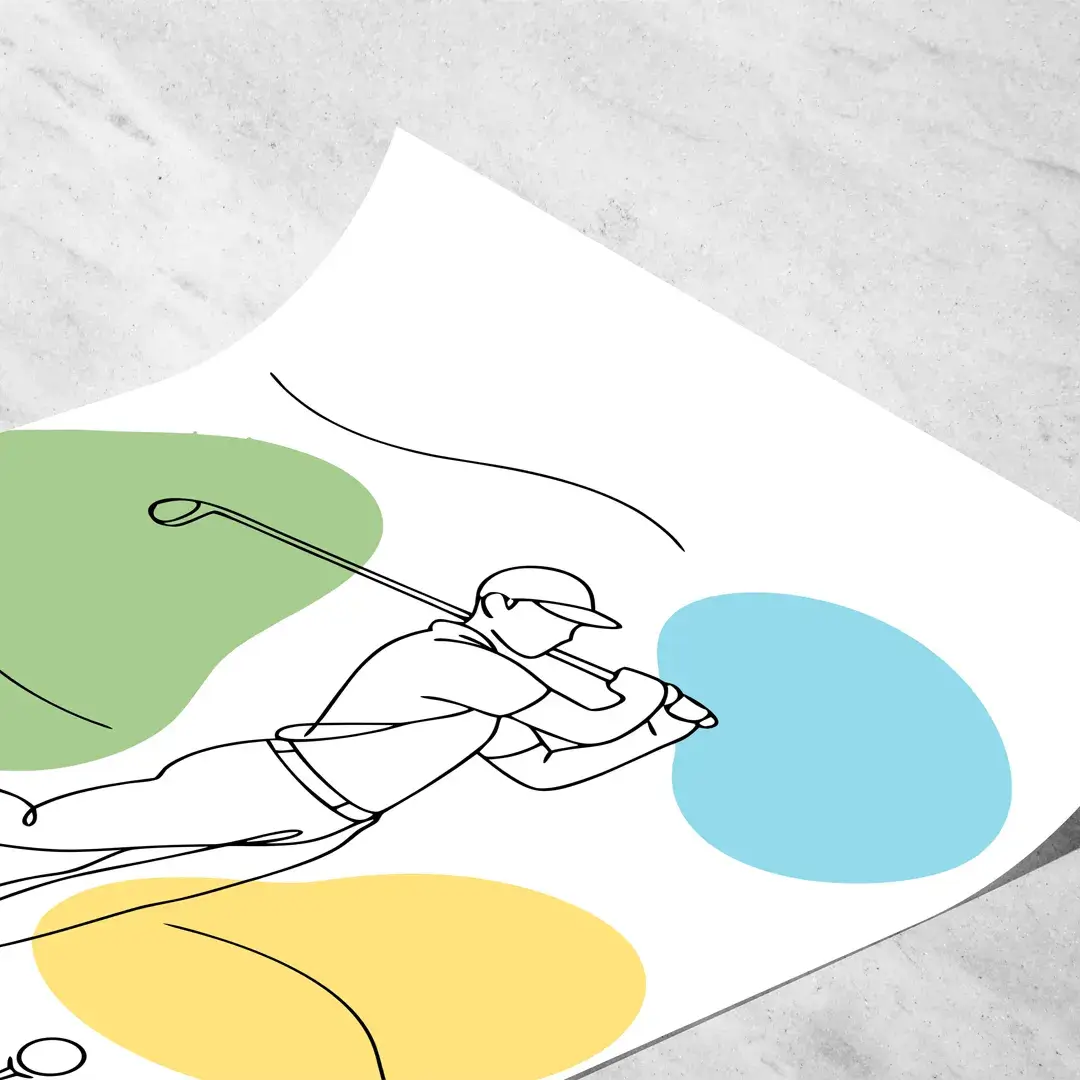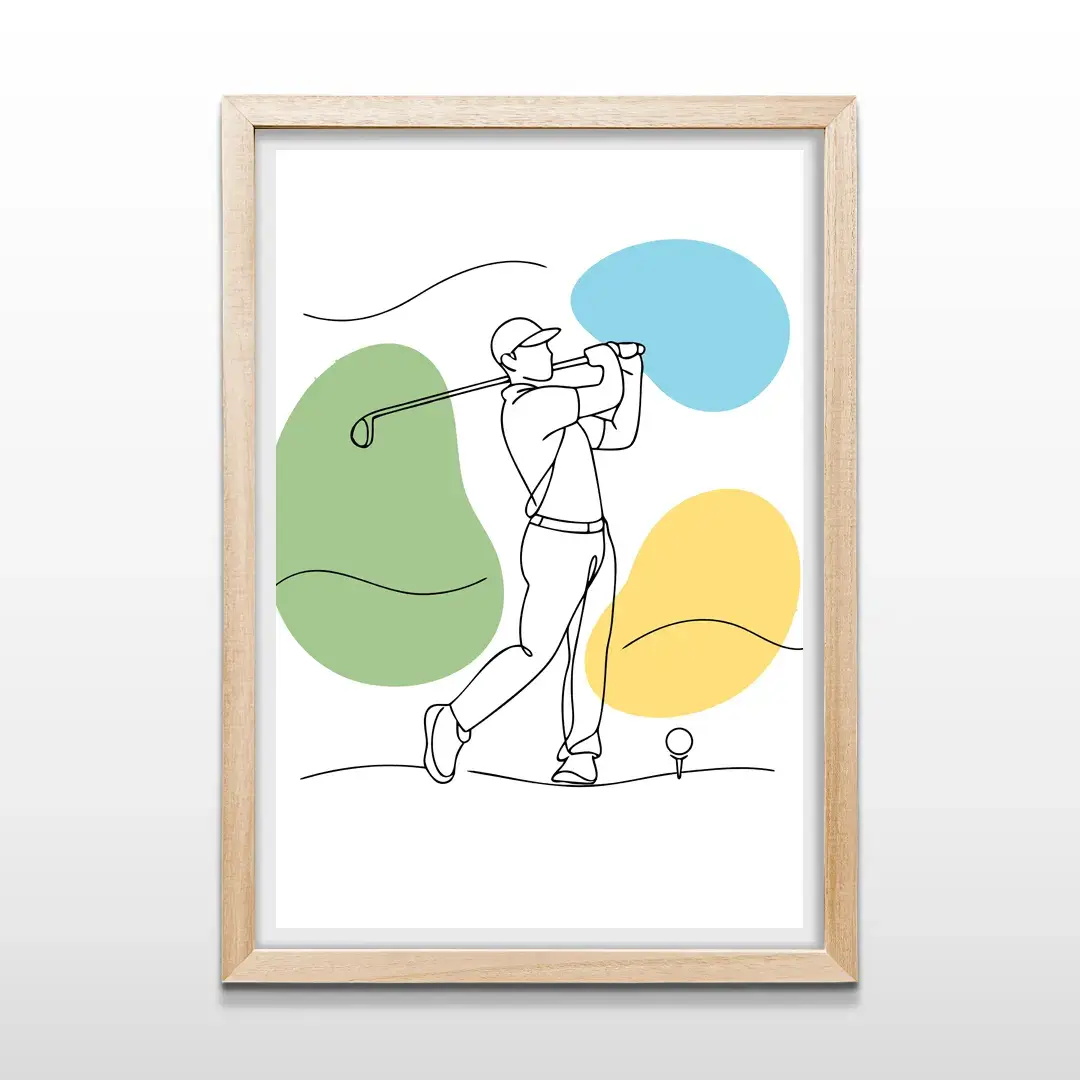 El cuadro decorativo Golf es una obra de arte moderno de estilo minimalista que representa la elegancia del swing perfecto mediante un dibujo lineal continuo y armónico. La composición combina formas orgánicas en tonos verde suave, celeste y amarillo, sobre un fondo blanco limpio que remite a la calma visual de los campos de golf más exclusivos y al equilibrio propio de este deporte de precisión.