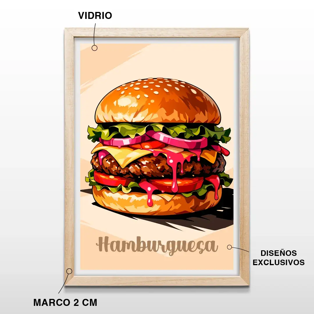 Este cuadro de hamburguesa moderno funciona de manera natural en cocinas de diseño, comedores informales, bares, hamburgueserías artesanales o locales gastronómicos que buscan una imagen joven, atractiva y con personalidad propia.