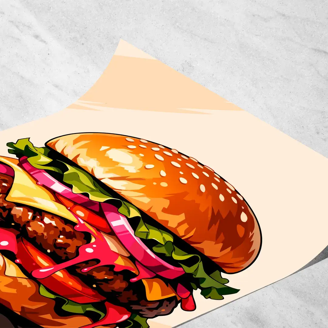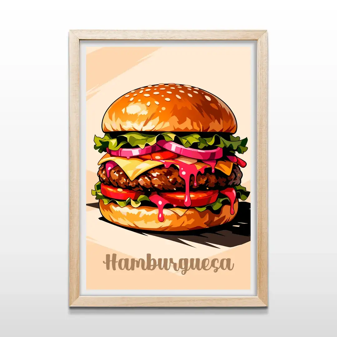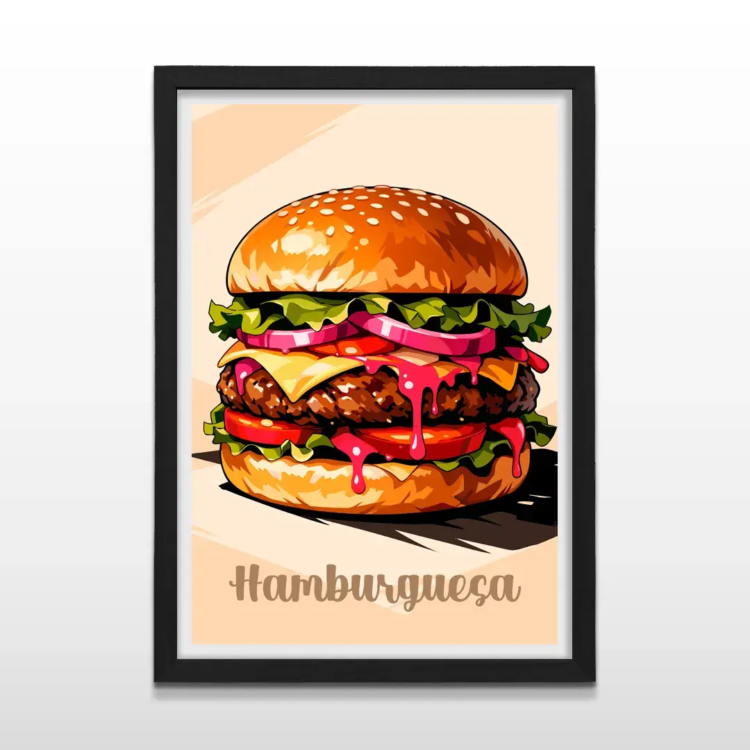 El cuadro decorativo Hamburguesa celebra el lado más icónico de la gastronomía urbana a través de una ilustración de alto impacto visual. La composición presenta una hamburguesa gourmet en primer plano, con capas claramente definidas de carne jugosa, queso fundido, cebolla morada y vegetales frescos, construyendo una imagen intensa que transmite sabor, abundancia y actitud contemporánea.