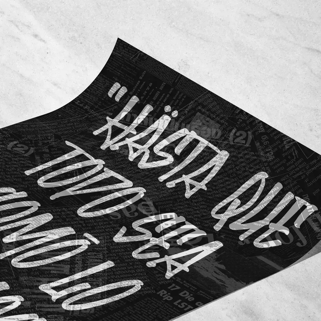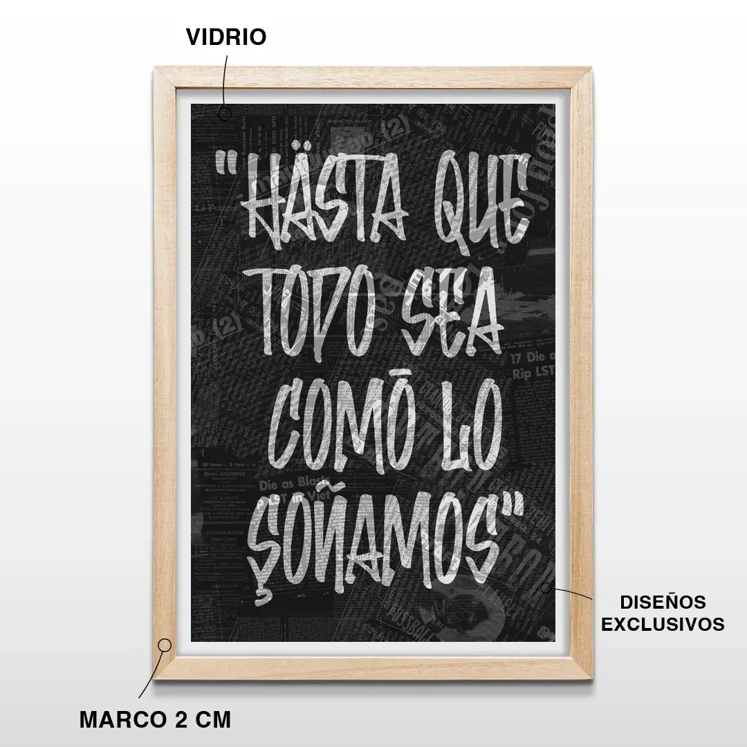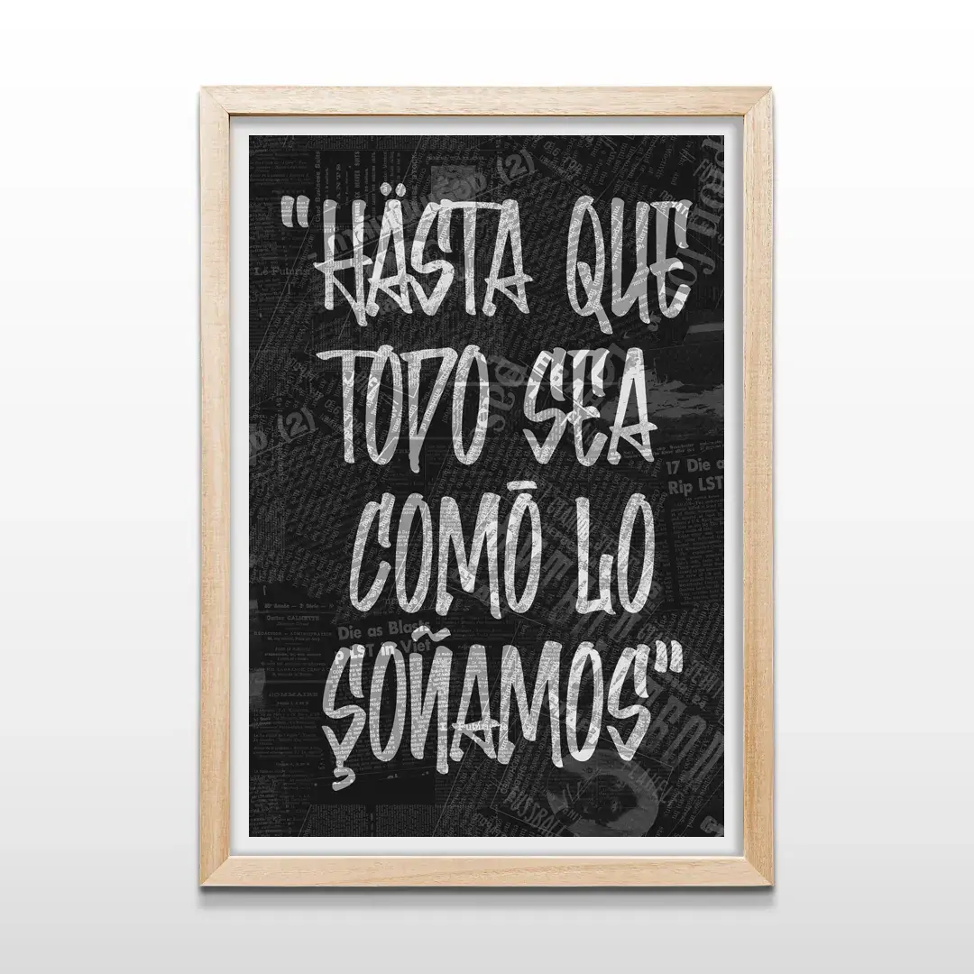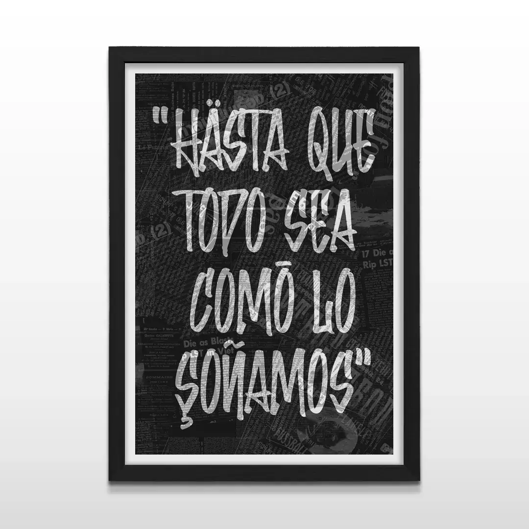 El cuadro decorativo Hasta Que Todo funciona como una declaración visual de convicción y empuje personal. La obra presenta la frase “Hasta que todo sea como lo soñamos” en una tipografía estilo graffiti blanco, con texturas desgastadas que refuerzan su carácter urbano, destacándose con fuerza sobre un fondo negro profundo compuesto por recortes de periódicos antiguos y tipografías vintage superpuestas.