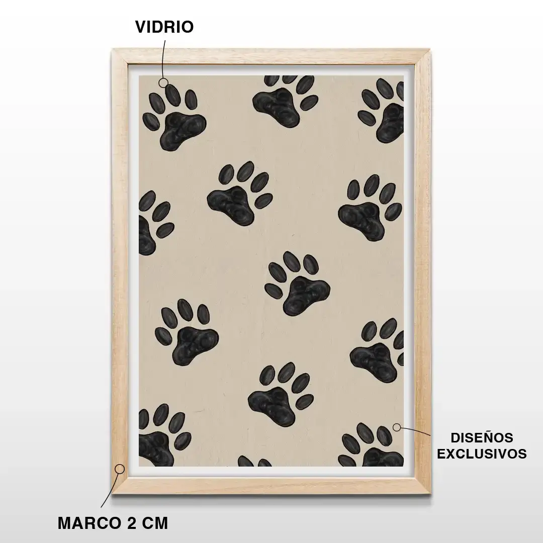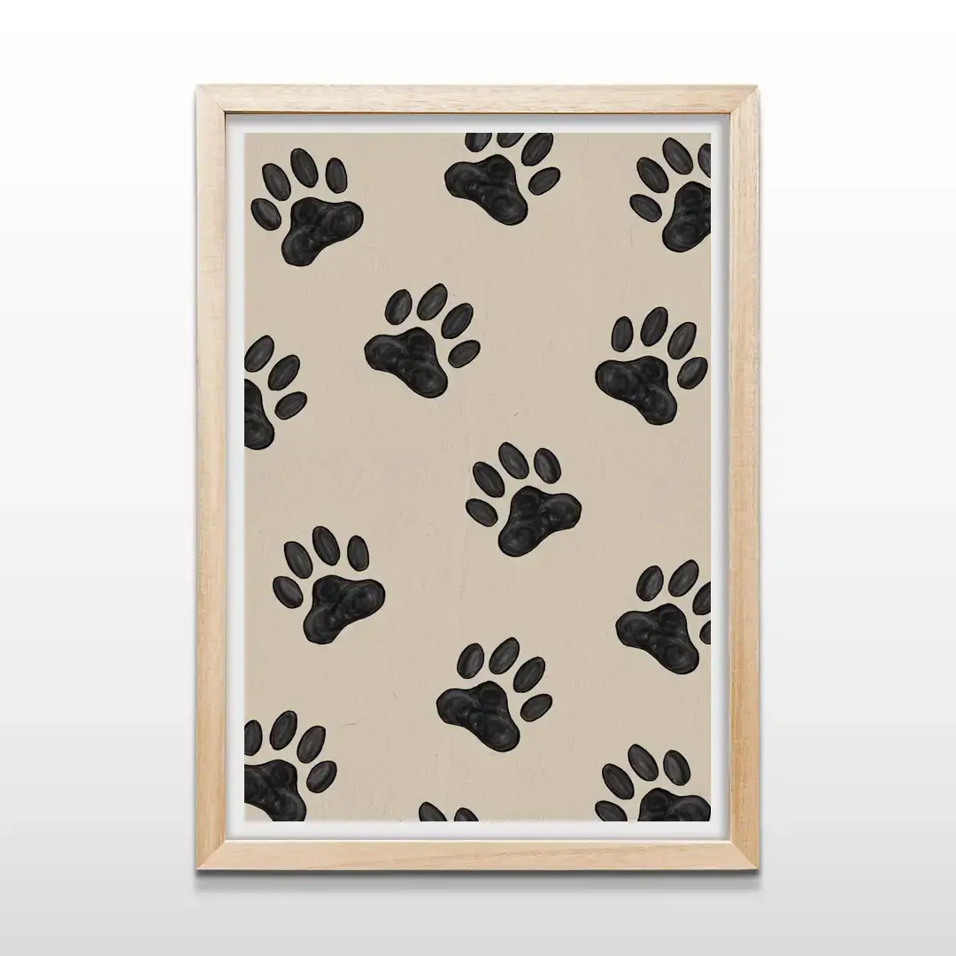 El cuadro decorativo Huella de Perro presenta una composición gráfica simple y expresiva inspirada en el vínculo cotidiano entre las personas y sus mascotas. El diseño muestra un patrón de huellas caninas en negro con una textura que simula pinceladas suaves, contrastando con un fondo crema de apariencia orgánica que aporta equilibrio y calidez visual.