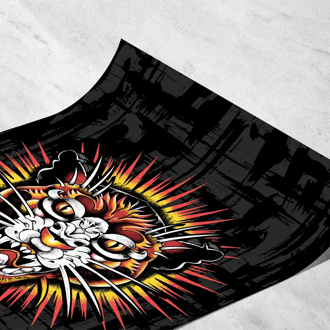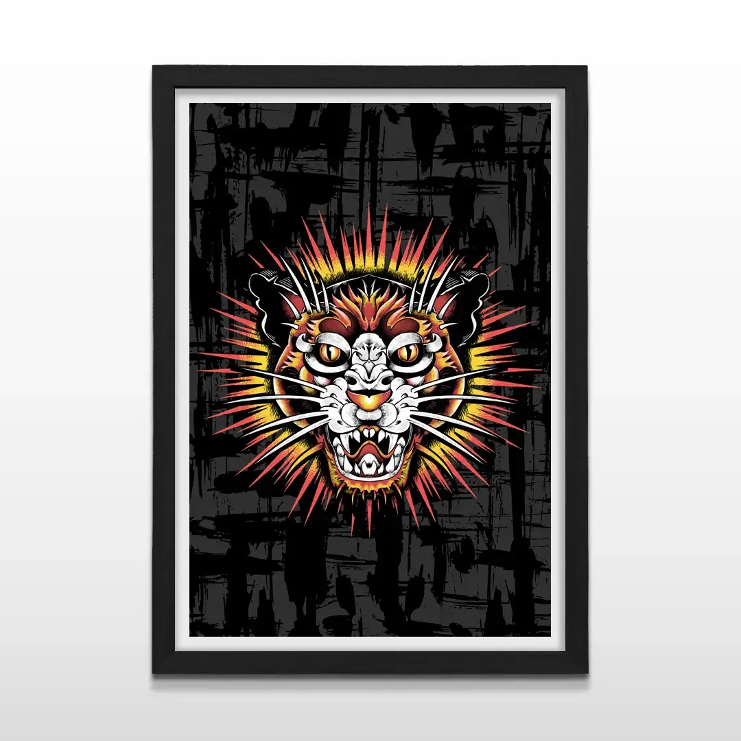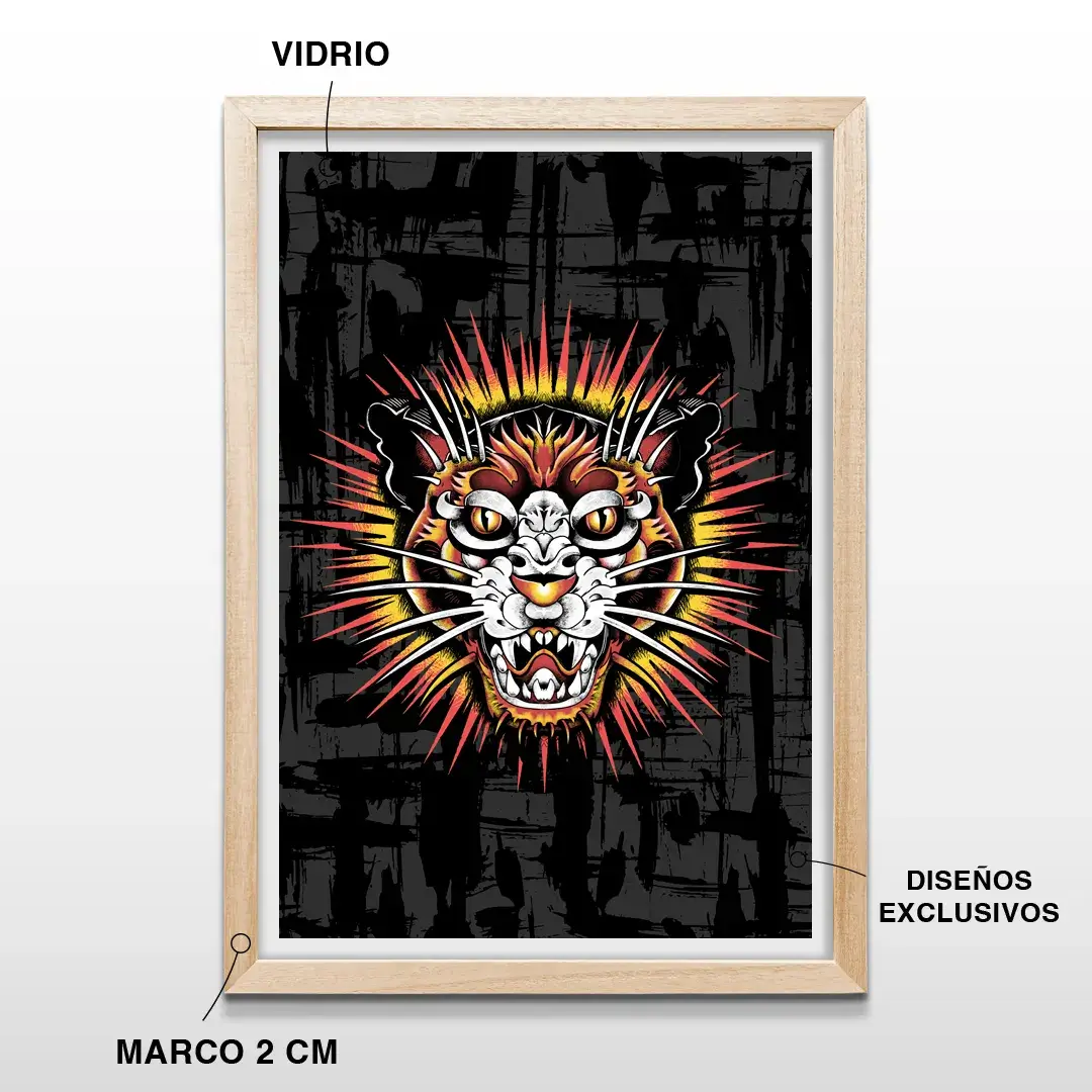 Este cuadro decorativo Jaguar Fuego representa al jaguar en su expresión más intensa, combinando la potencia del felino americano con una interpretación visual cargada de energía. La ilustración utiliza una paleta de colores encendidos y trazos dinámicos que emergen sobre un fondo oscuro texturizado, generando una sensación de movimiento y fuerza contenida.