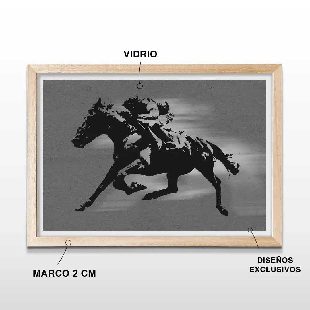 Pensado para quienes desean comprar cuadros decorativos ecuestres en Argentina, este cuadro de jockey y caballo al galope es una pieza de wall art premium que aporta dinamismo visual, sofisticación deportiva y una narrativa poderosa ligada a la nobleza y la adrenalina del mundo hípico.