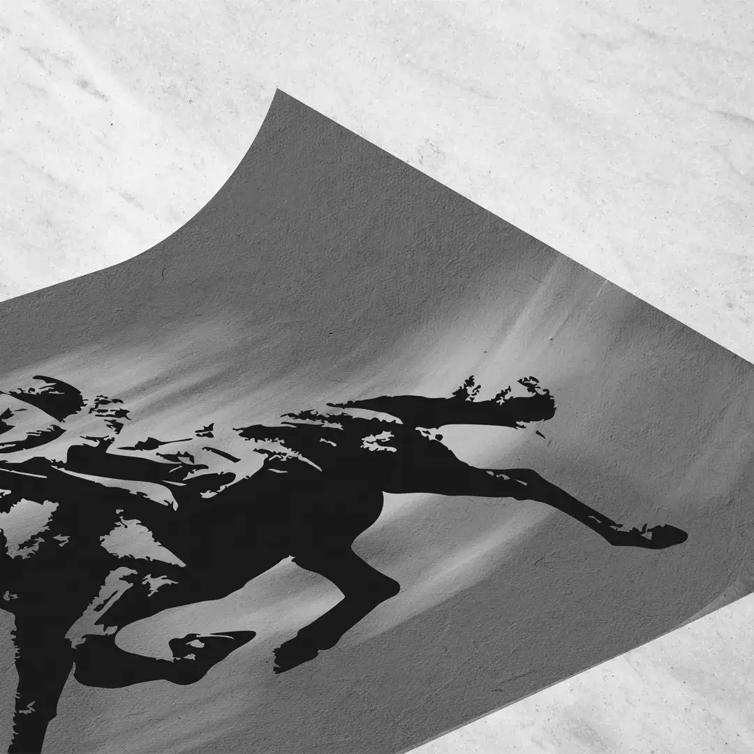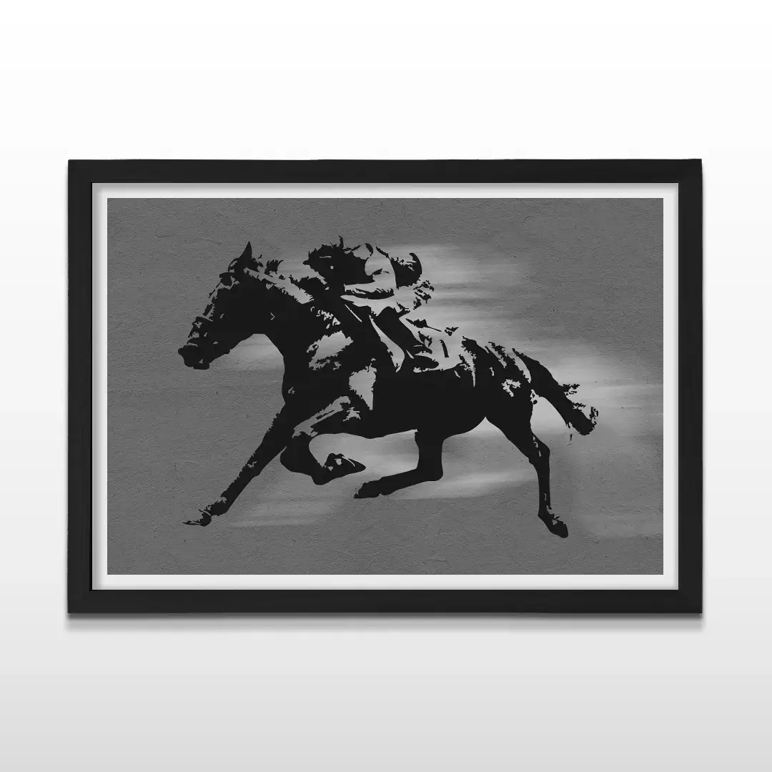 El cuadro decorativo Jockey interpreta la intensidad del turf desde una mirada contemporánea, combinando movimiento, tensión y elegancia en una composición de arte abstracto minimalista. La escena muestra la silueta estilizada de un jinete y su caballo lanzados al galope, casi fusionados en una estela dinámica que transmite velocidad, control y determinación sobre un fondo gris cemento de textura sobria y moderna.