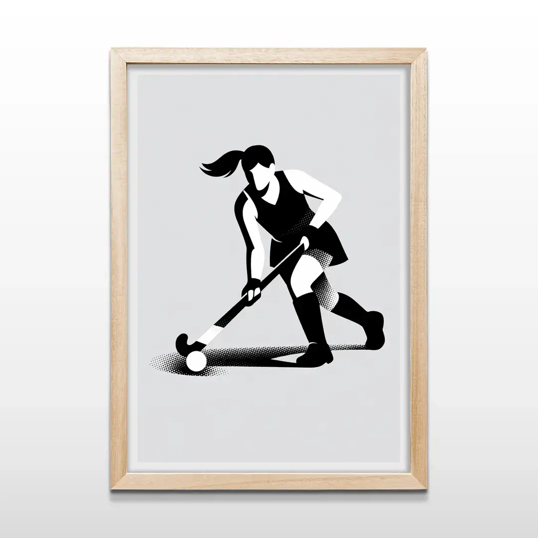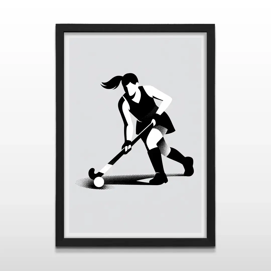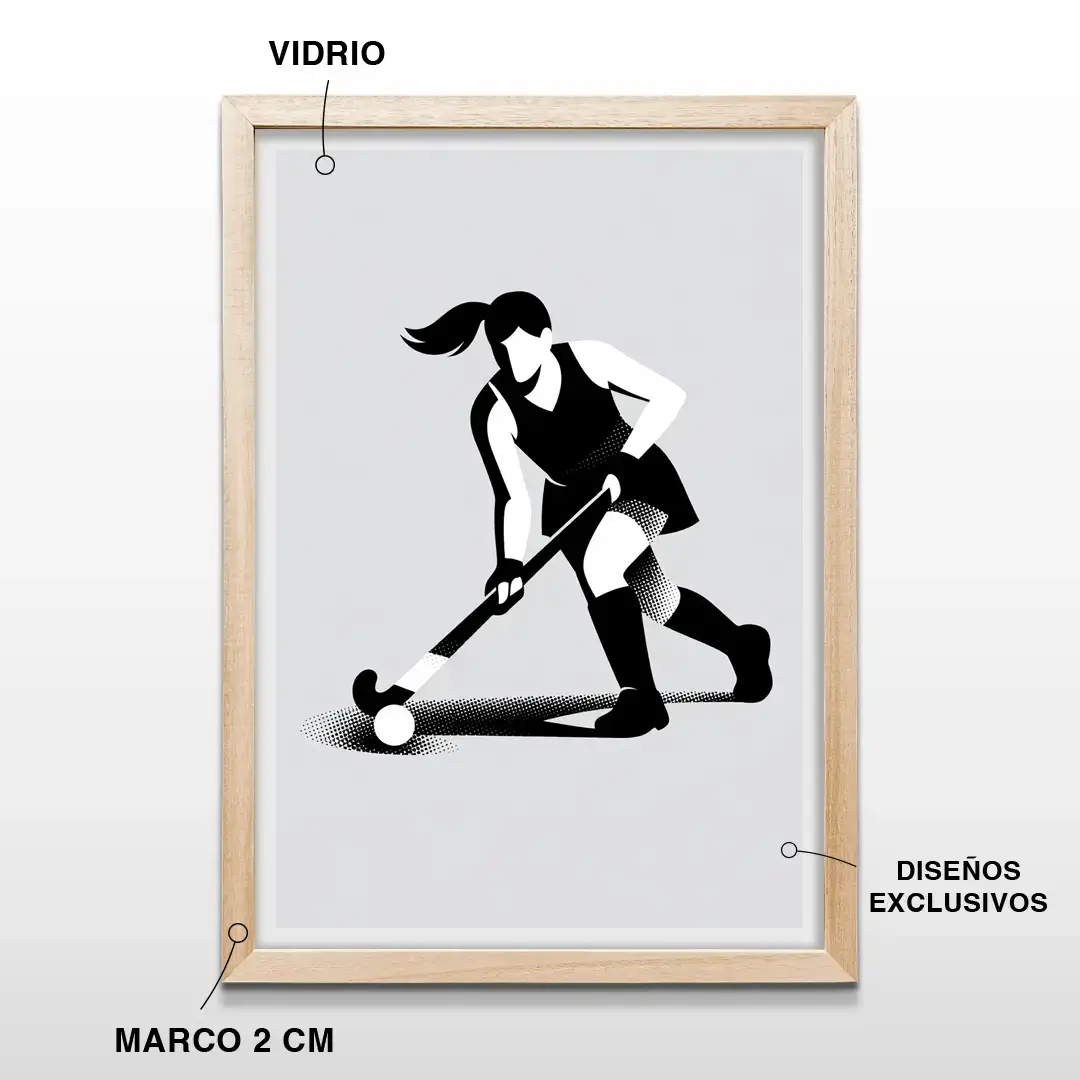 El cuadro decorativo Jugadora de Hockey captura la intensidad del juego en su punto más técnico, transformando el movimiento en una imagen clara, firme y contemporánea. La obra presenta la silueta de una jugadora en plena acción, controlando la bocha con precisión y dominio, construida a partir de formas sólidas en negro y blanco que se recortan con fuerza sobre un fondo gris neutro, logrando un equilibrio visual entre potencia y elegancia.