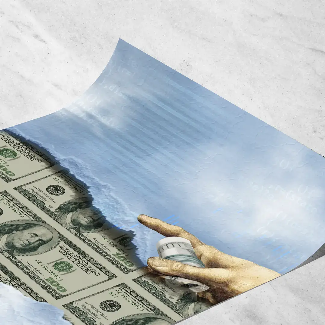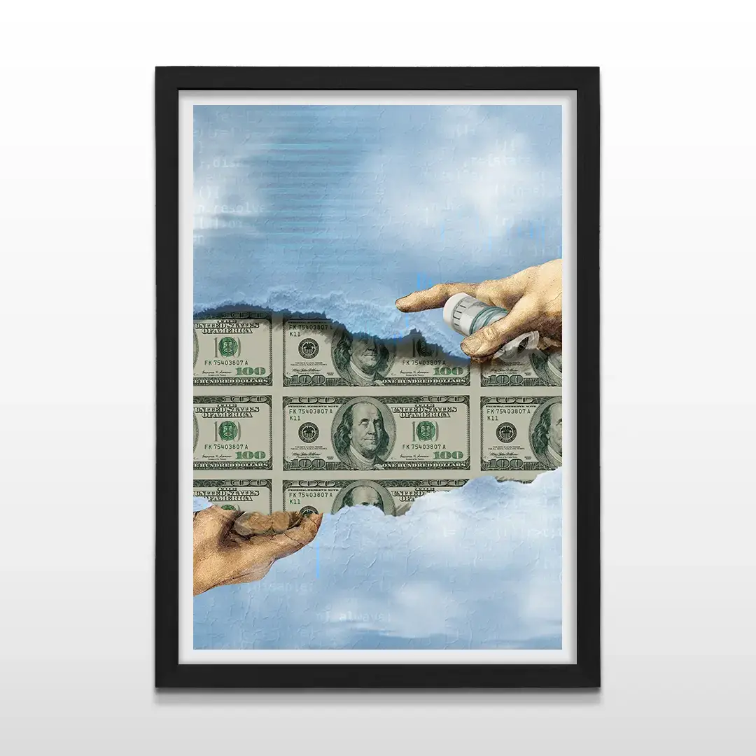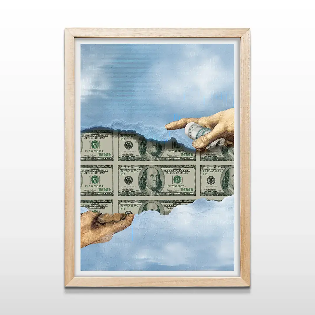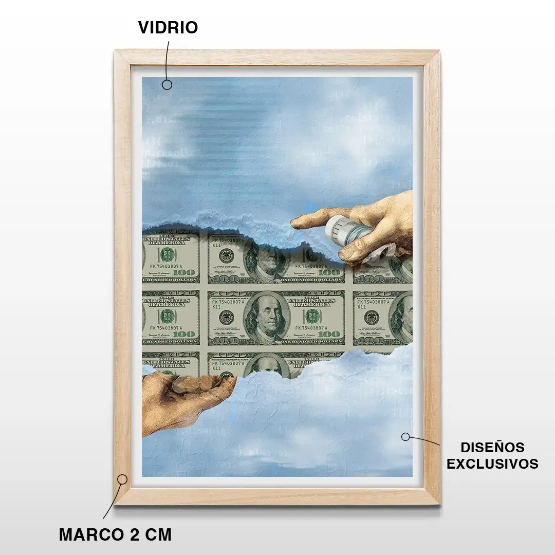 El cuadro decorativo La Creación Dólar propone una relectura provocadora del arte clásico aplicada al imaginario contemporáneo del poder económico. La composición fusiona las manos icónicas de La Creación con un collage digital surrealista donde un fajo de billetes irrumpe a través de una rasgadura celestial, dejando al descubierto un universo infinito de dólares que simboliza ambición, control y visión de futuro.