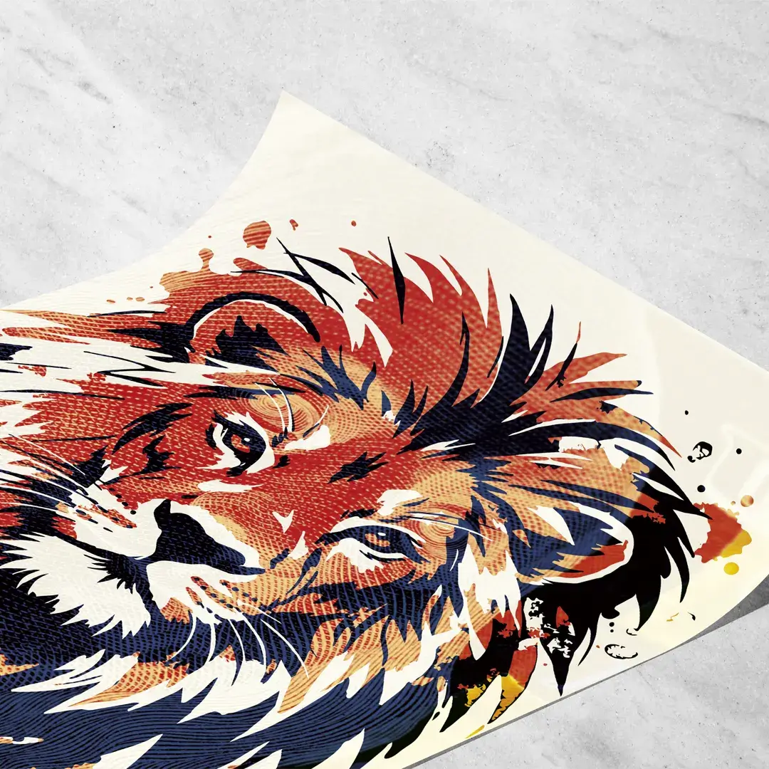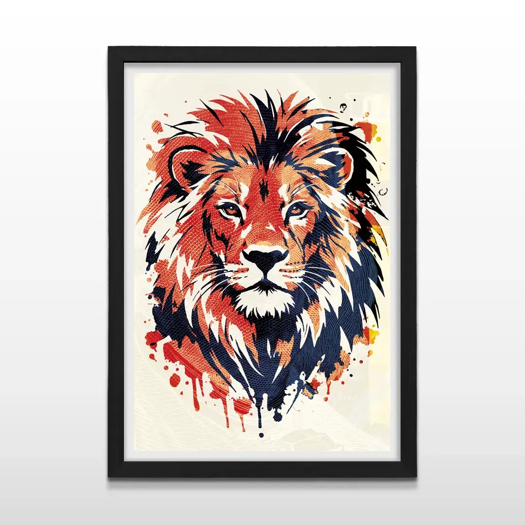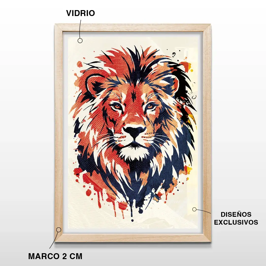 El cuadro decorativo León Dólar es una pieza de arte digital moderno que fusiona poder, liderazgo y ambición económica a través de una imagen impactante. El retrato de un león imponente se construye a partir de una detallada textura inspirada en grabados de billetes de dólar, combinada con salpicaduras de color que aportan energía y contraste sobre un fondo crema de estética minimalista. El resultado es una composición visual fuerte, elegante y cargada de simbolismo financiero.