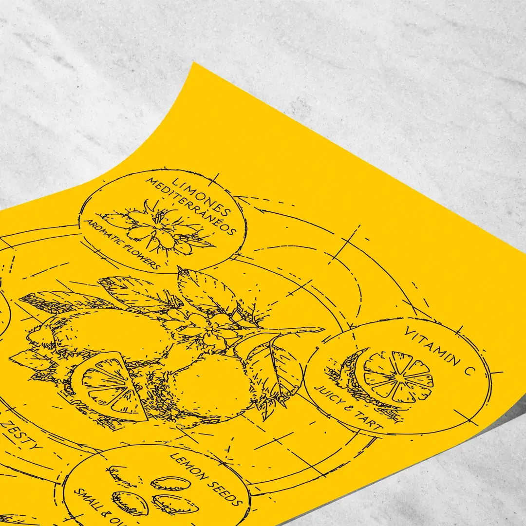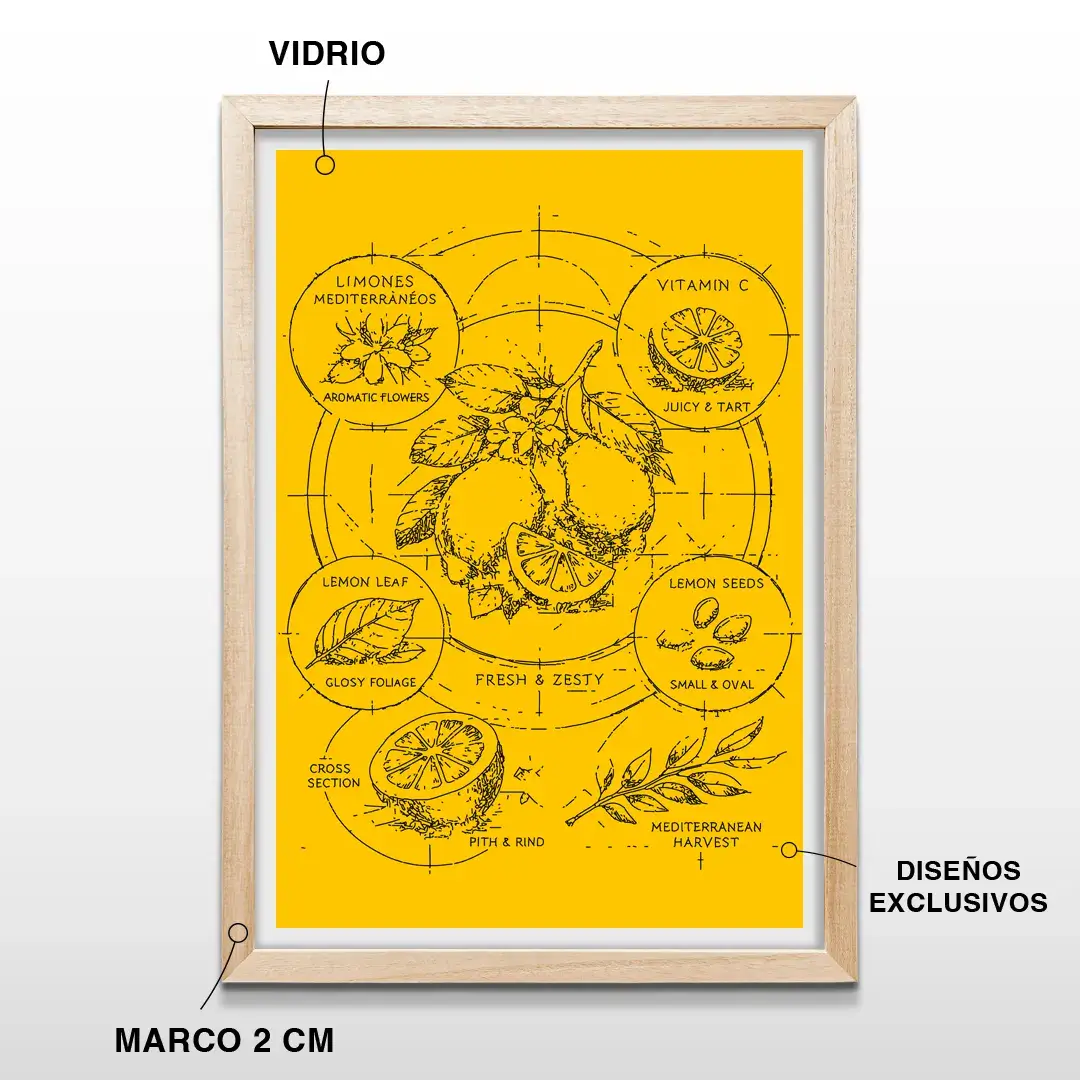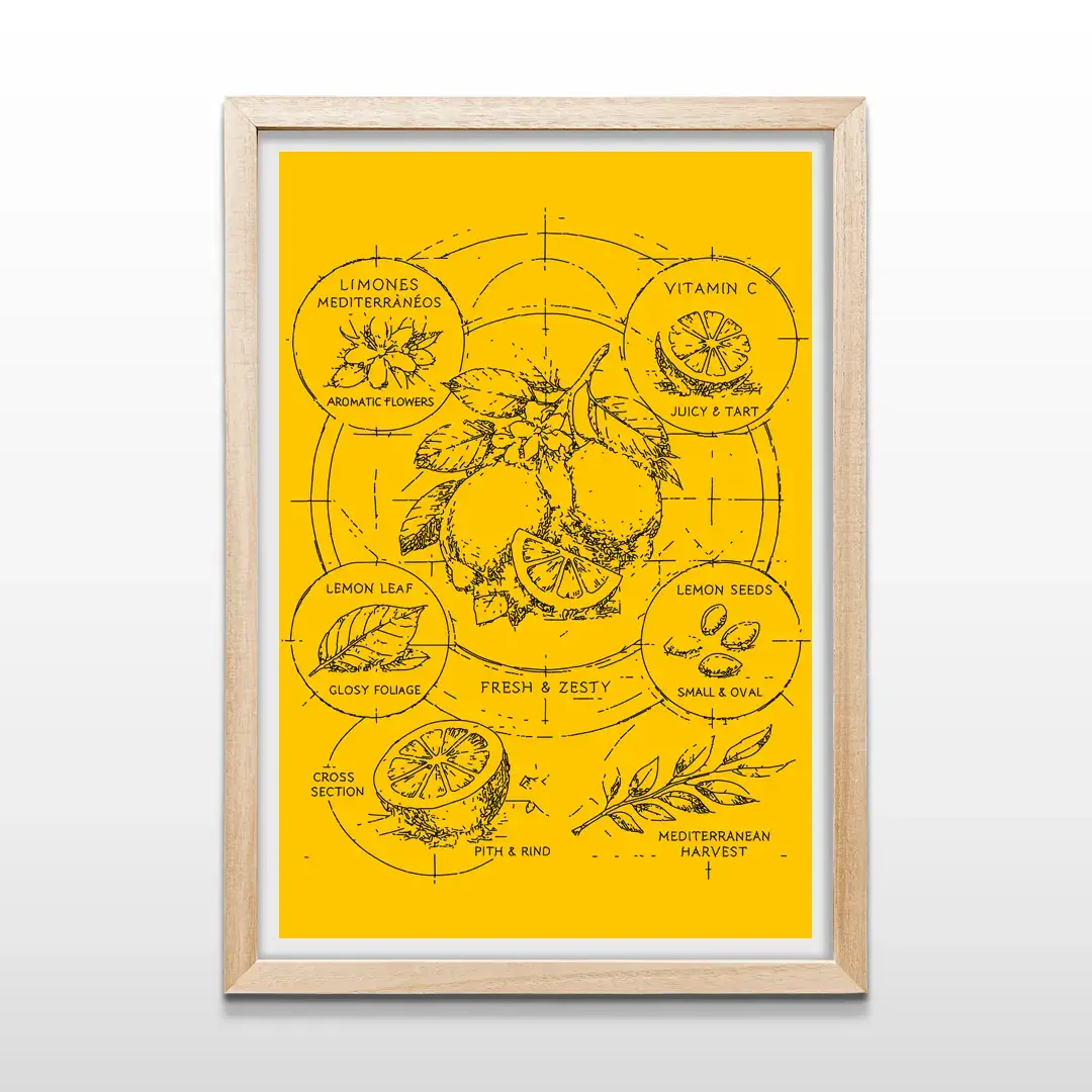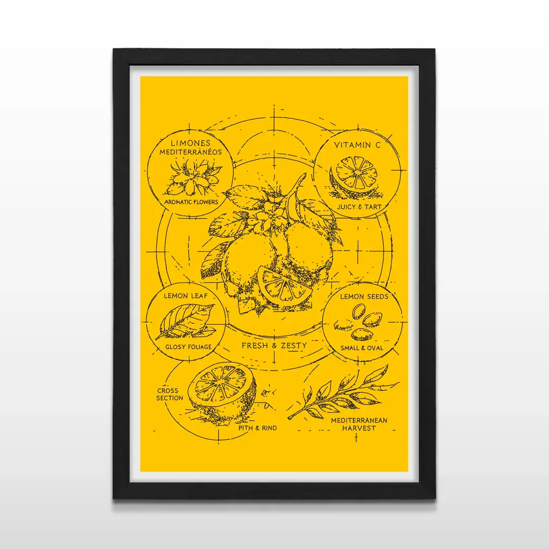 El cuadro decorativo Limones Mediterráneos destaca por su estética botánica contemporánea y una luminosidad vibrante que remite de inmediato a la costa italiana. La ilustración presenta un diagrama detallado del limón, con cortes transversales, semillas, hojas y flores, desarrollados con precisión técnica sobre un fondo amarillo intenso que potencia su carácter fresco y solar. La composición combina ciencia, diseño y naturaleza en una pieza visual limpia, equilibrada y llena de energía.