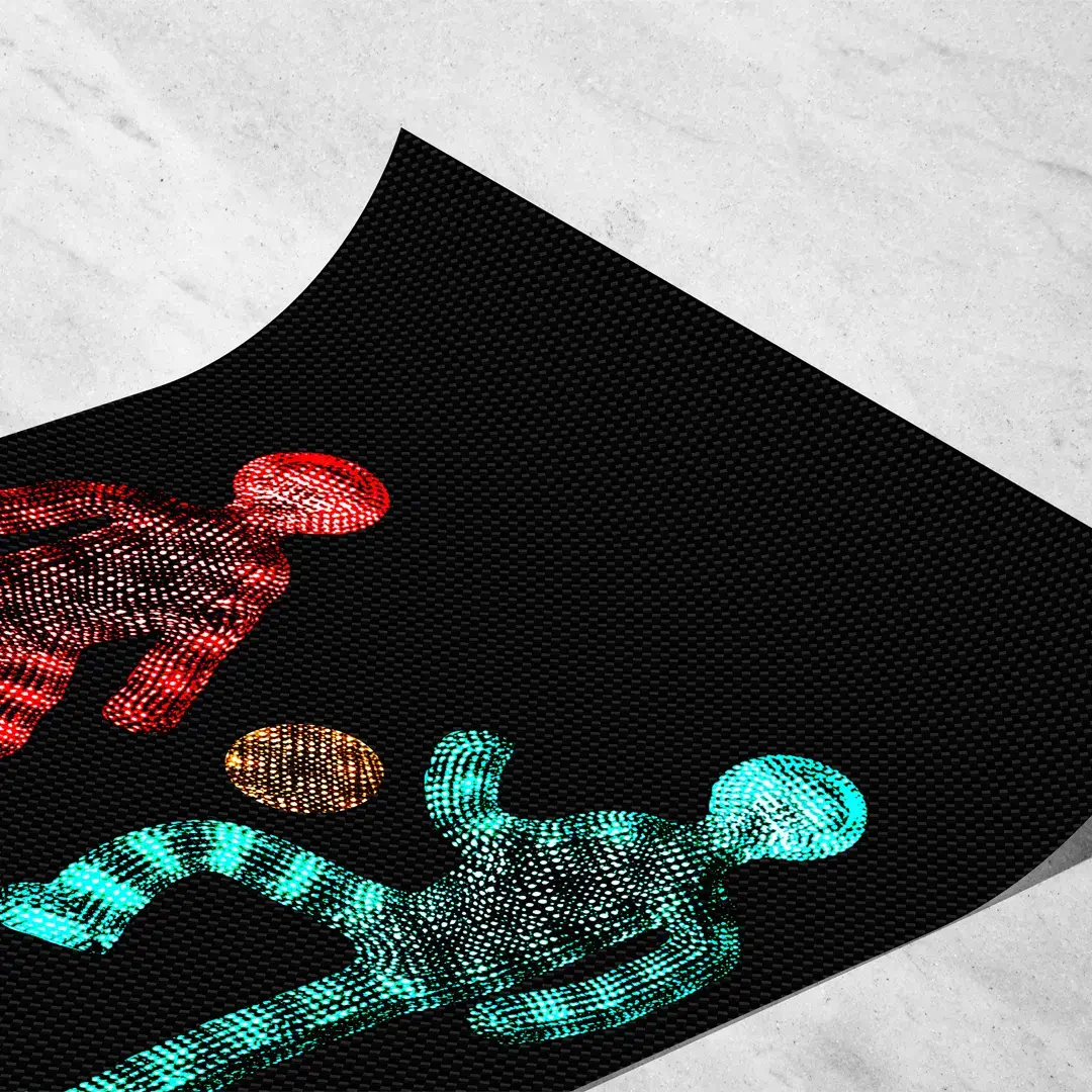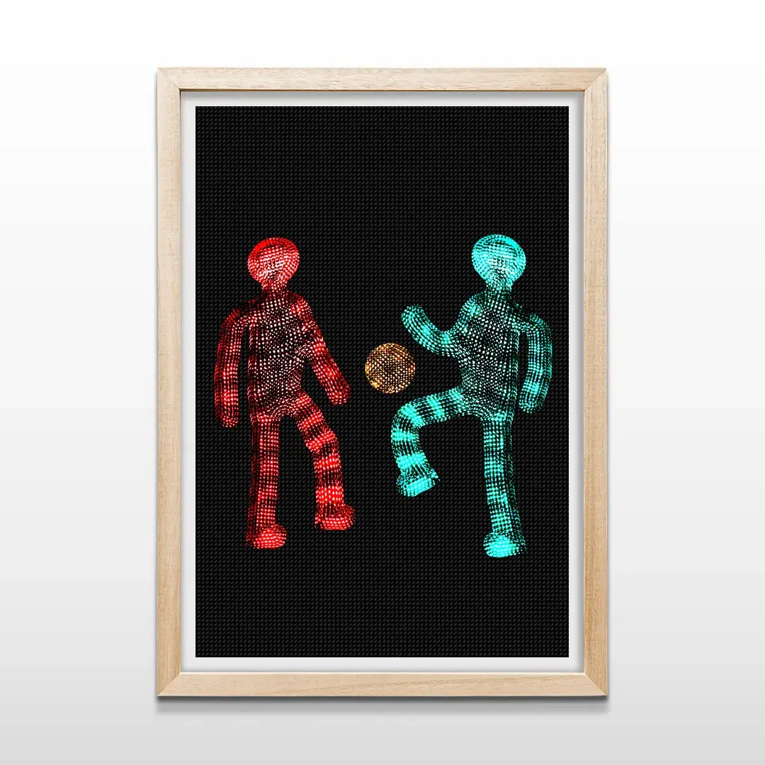 El cuadro decorativo Los Jugadores reinterpreta el paisaje urbano con una mirada lúdica y contemporánea, convirtiendo a los clásicos íconos del semáforo peatonal en protagonistas de un partido improvisado. Las figuras del hombre rojo y el hombre verde cobran vida a través de una trama de puntos luminosos que simulan energía y movimiento, destacándose con fuerza sobre un fondo negro profundo de alto contraste.