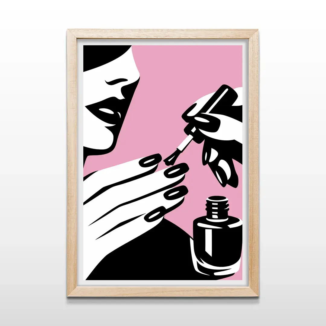El cuadro decorativo Manicura traduce el universo de la belleza en una imagen precisa, elegante y contemporánea. La composición presenta una silueta femenina en blanco y negro realizando un gesto delicado de esmaltado, donde el trazo del pincel se convierte en protagonista visual. El fondo rosa pastel suaviza la escena y aporta una identidad claramente ligada al cuidado personal, la estética y el detalle.