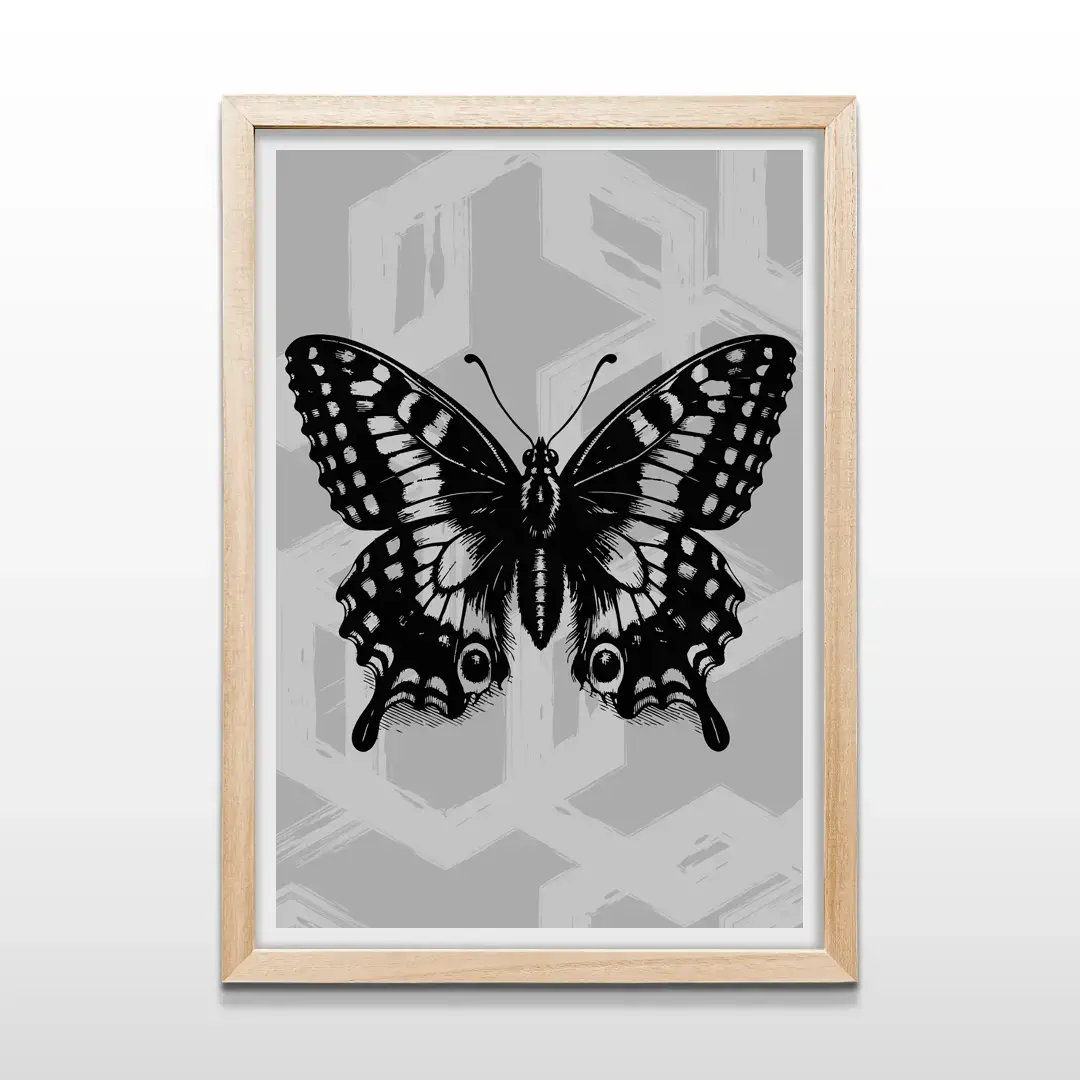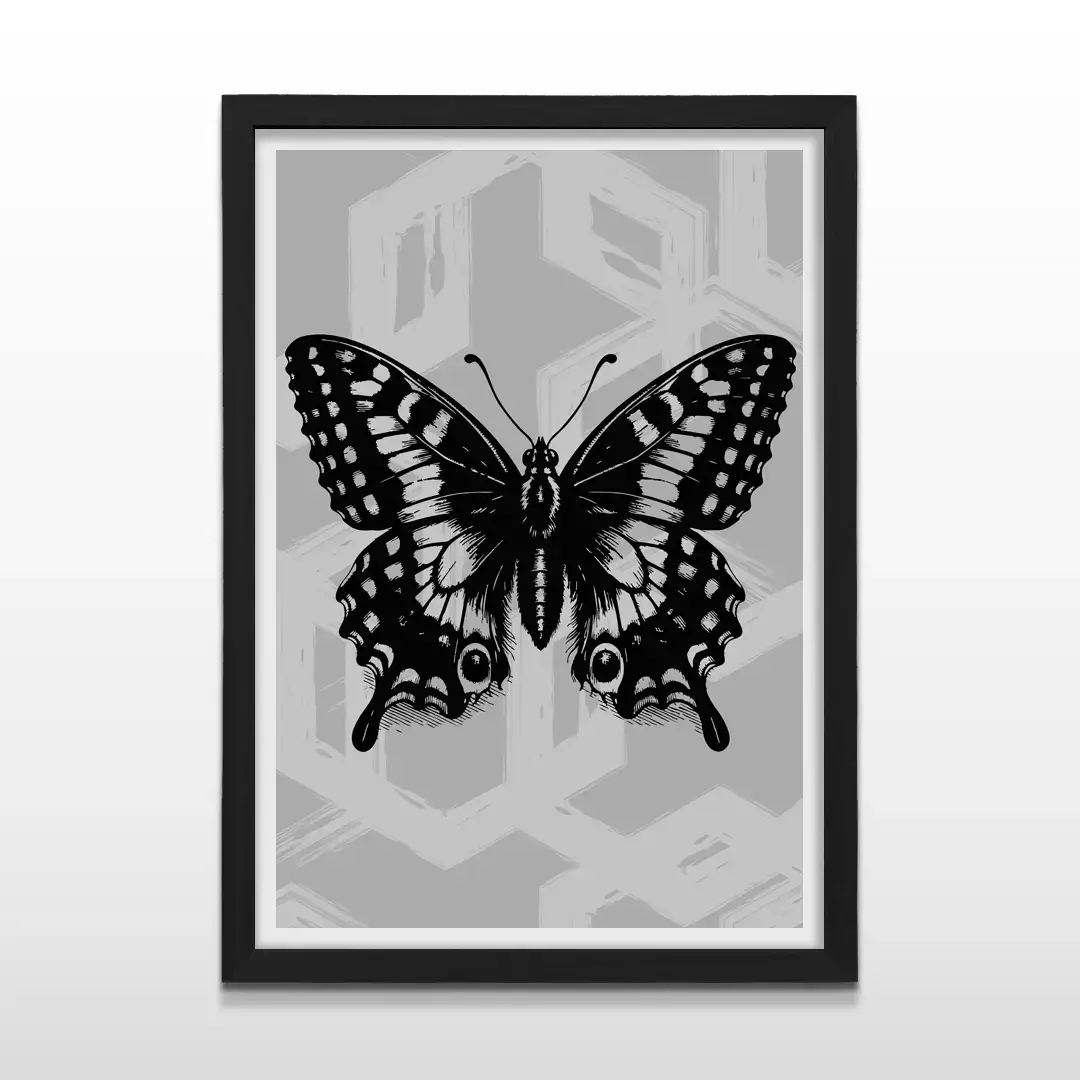 El cuadro decorativo Mariposa Abstracta propone una lectura visual intensa y refinada a partir de una ilustración de inspiración vintage reinterpretada con códigos contemporáneos. La silueta de la mariposa, resuelta en negro profundo, revela detalles de filigrana orgánica que dialogan con un fondo de geometrías grises, texturas desgastadas y matices urbanos que aportan carácter y profundidad.