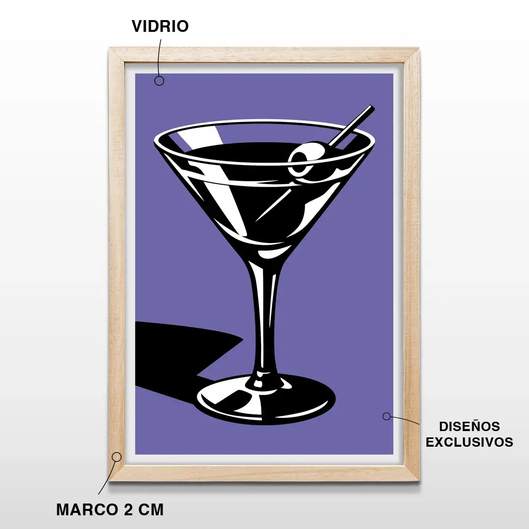 Este cuadro decorativo de martini moderno se integra con naturalidad en barras de cócteles, livings de diseño, comedores elegantes o espacios de recepción que buscan una identidad visual distinguida y actual.