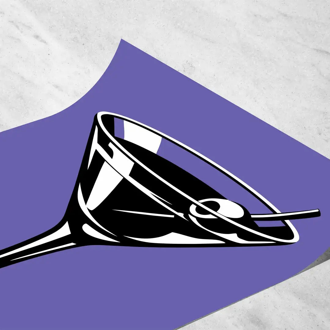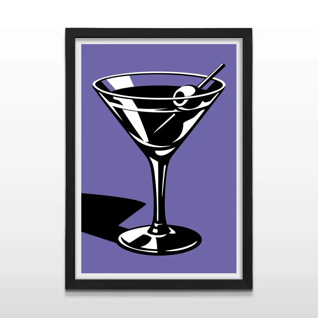 El cuadro decorativo Martini Abstracto sintetiza el encanto del cóctel más icónico a través de una composición gráfica precisa y elegante. La obra presenta la silueta de una copa Martini con aceituna, resuelta en un contraste nítido de blanco y negro que se impone con claridad sobre un fondo lavanda intenso, logrando un equilibrio visual entre sobriedad clásica y estética contemporánea.