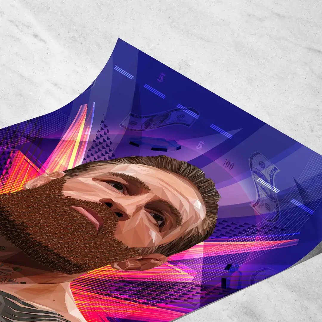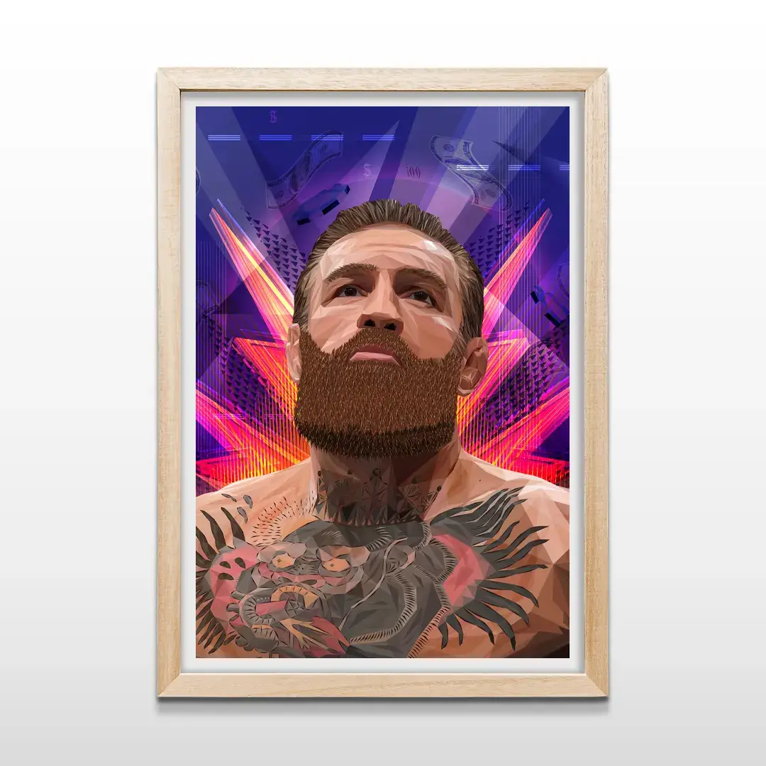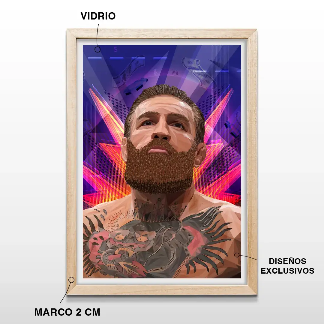 El cuadro decorativo McGregor es una obra de arte digital de alto impacto que celebra la energía, disciplina y gloria de la leyenda de las MMA. La composición muestra a Conor McGregor en un retrato geométrico estilizado, con la mirada desafiante sobre un fondo de luces vibrantes y billetes cayendo, simbolizando la recompensa del esfuerzo, la victoria y la mentalidad ganadora.