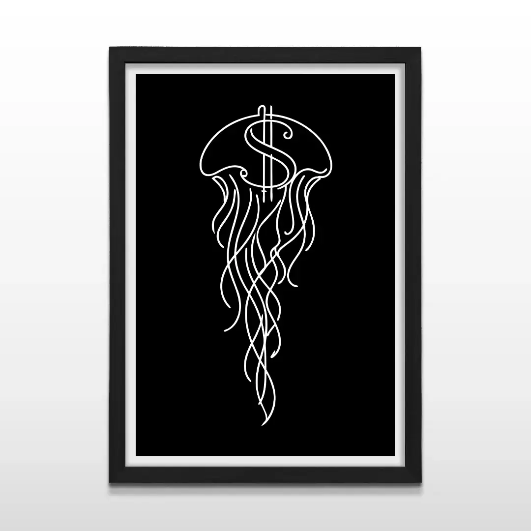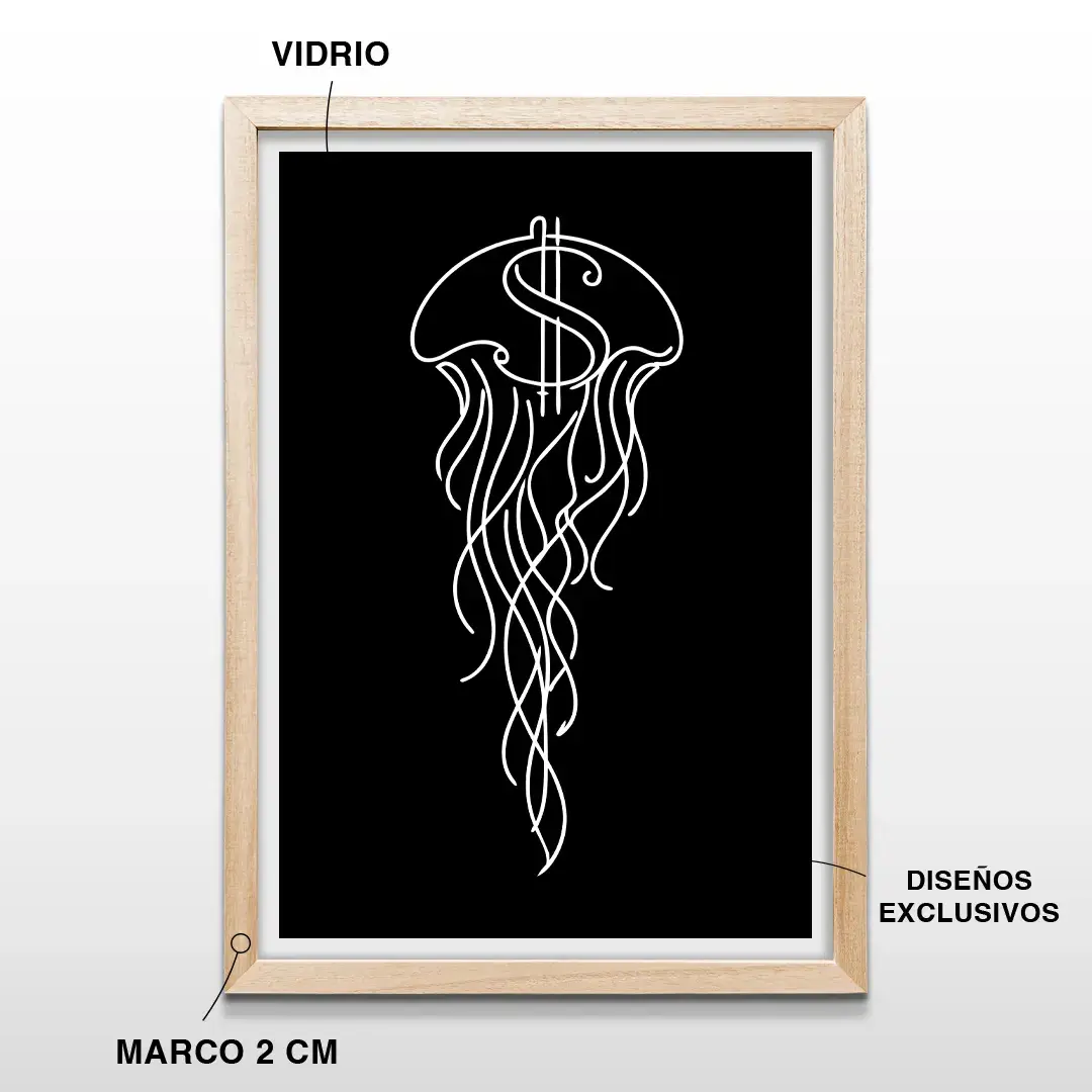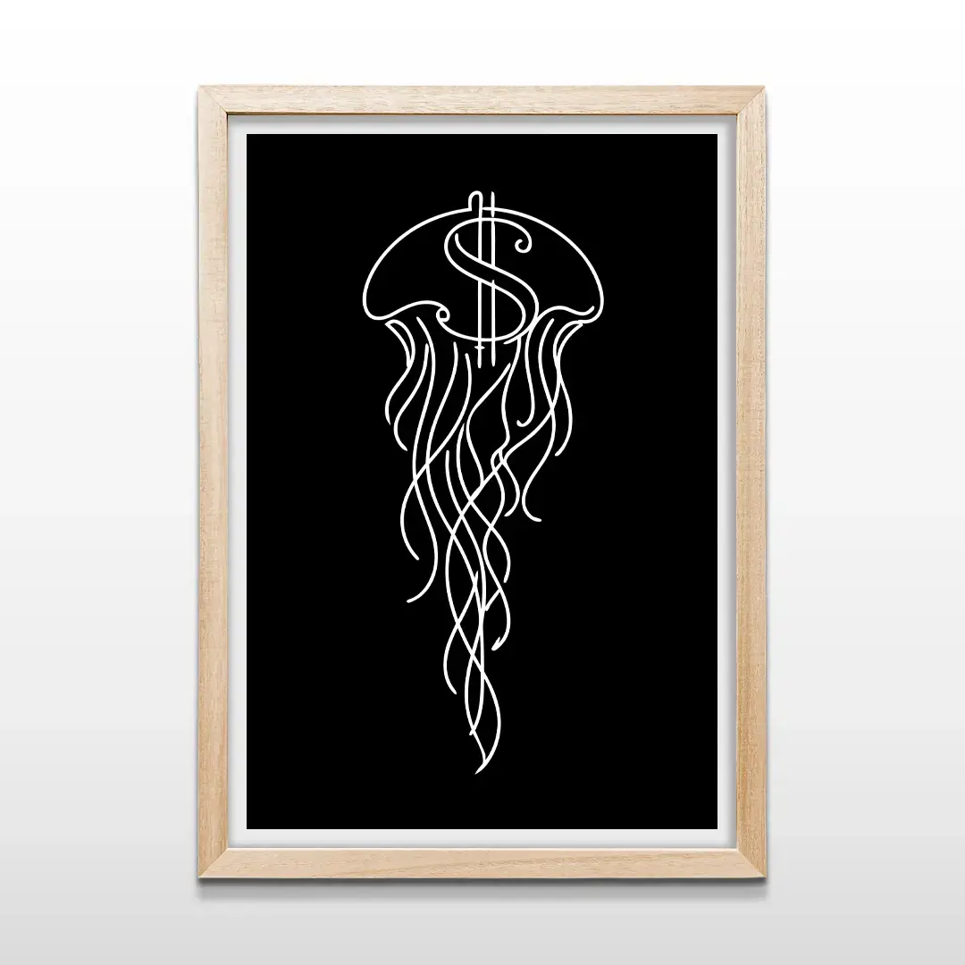 El cuadro decorativo Medusa Dólar es una obra de arte moderno de estética minimalista que fusiona simbolismo financiero y fluidez visual en una composición elegante y contemporánea. La silueta lineal blanca de una medusa se transforma de manera orgánica en un símbolo de dólar, creando una imagen poderosa sobre un fondo negro profundo que enfatiza el contraste y la sofisticación del diseño.