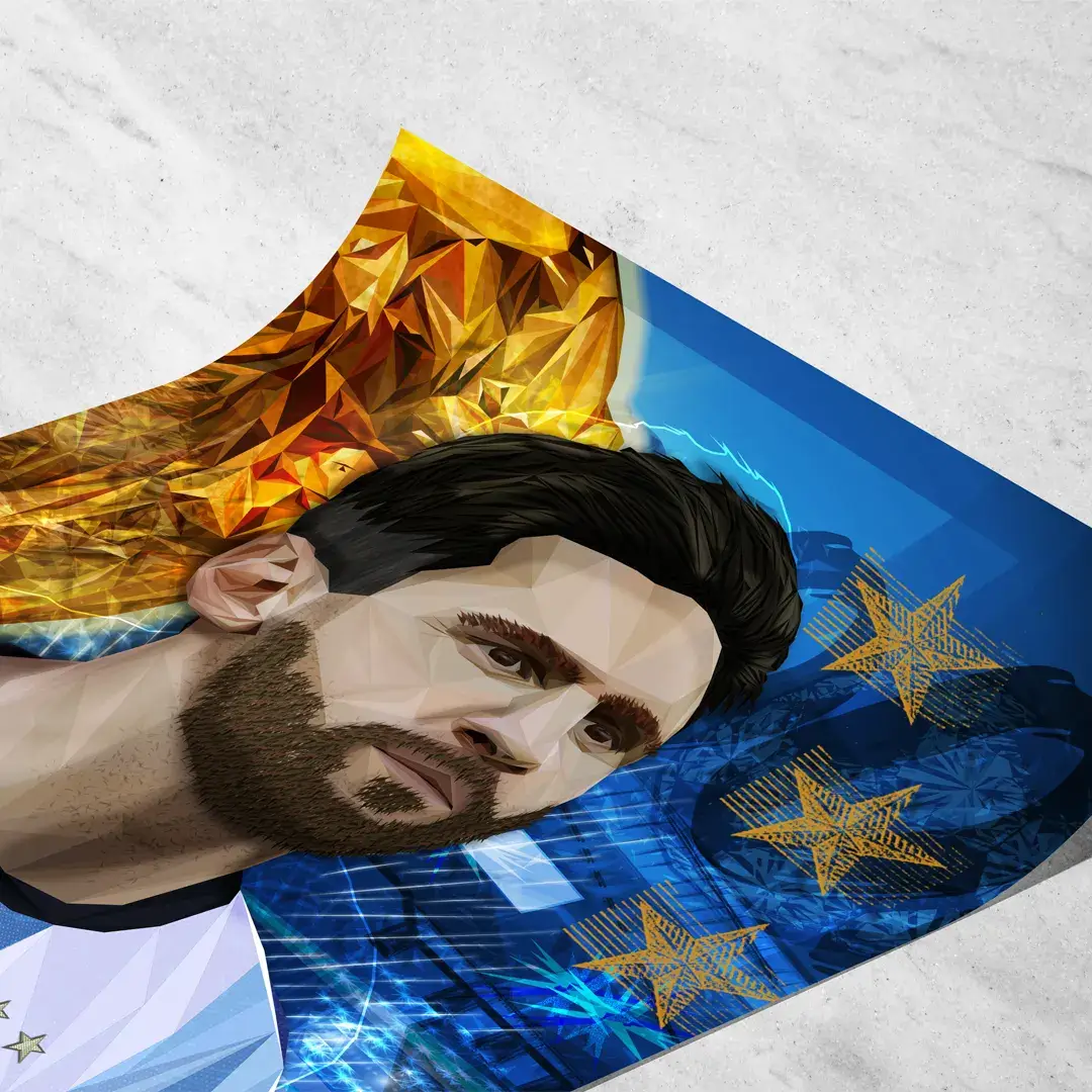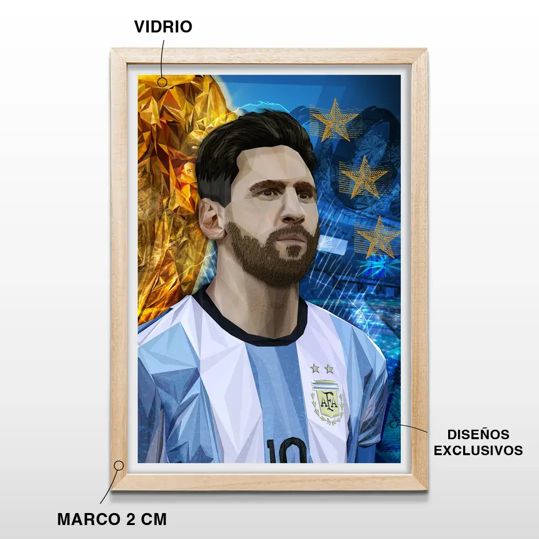 El cuadro decorativo Messi es una obra de arte deportivo contemporáneo que celebra la gloria máxima del fútbol argentino. Presenta un retrato geométrico de Lionel Messi con expresión serena y triunfal, acompañado de la Copa del Mundo y las tres estrellas doradas que brillan sobre un fondo de rayos celestes y estadios vibrantes.