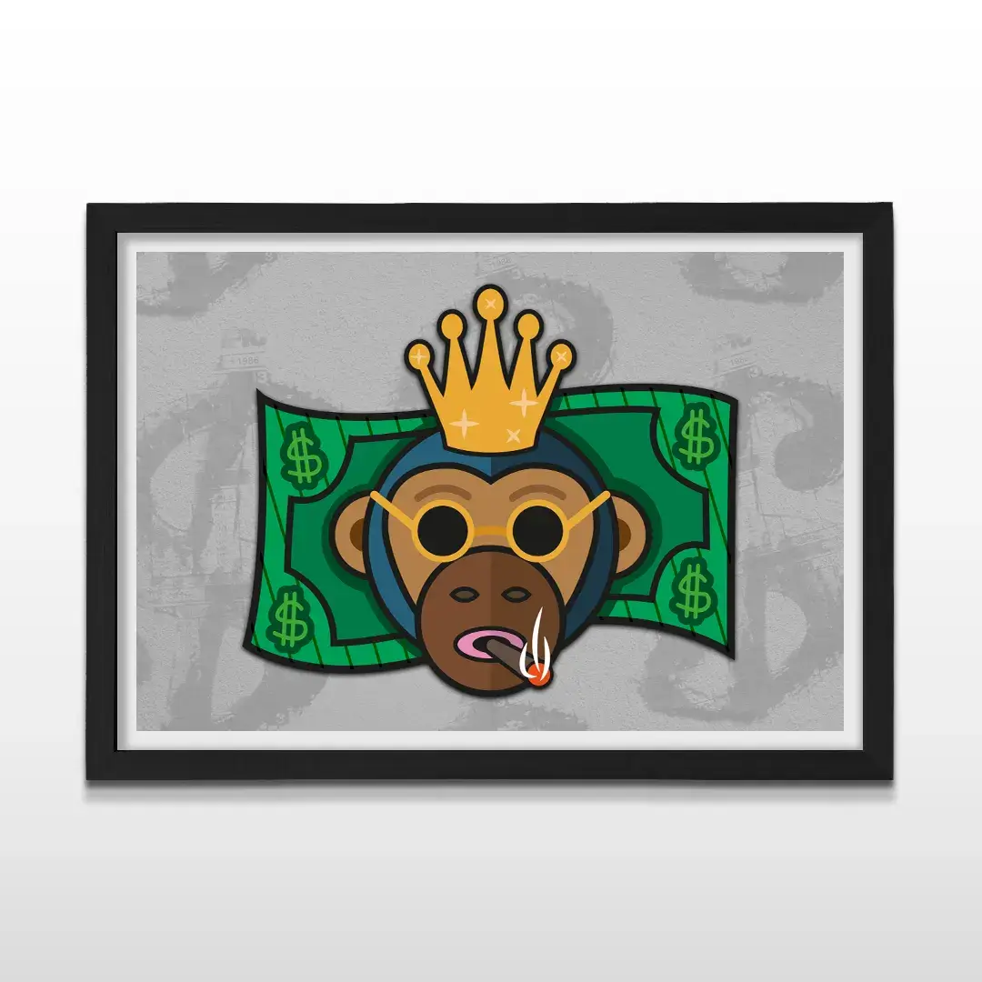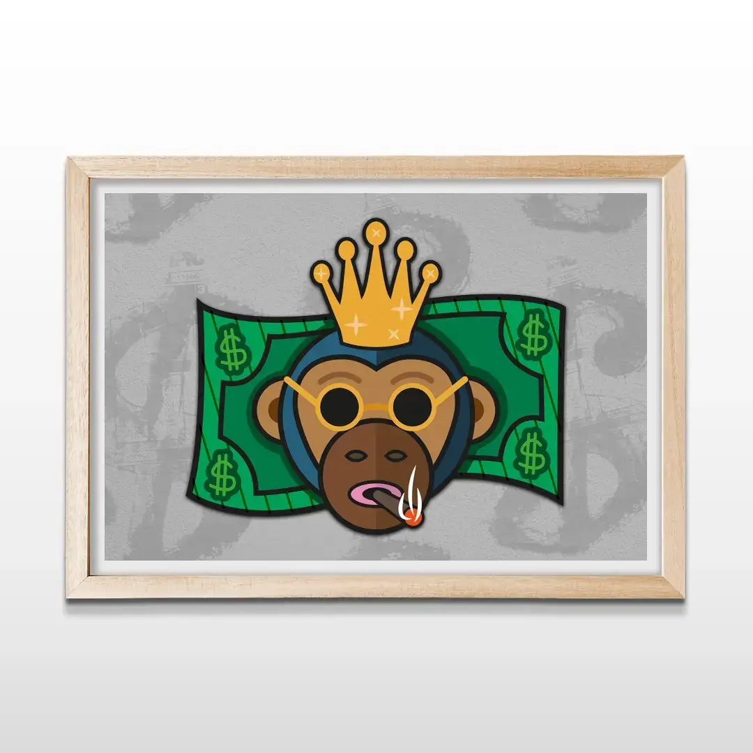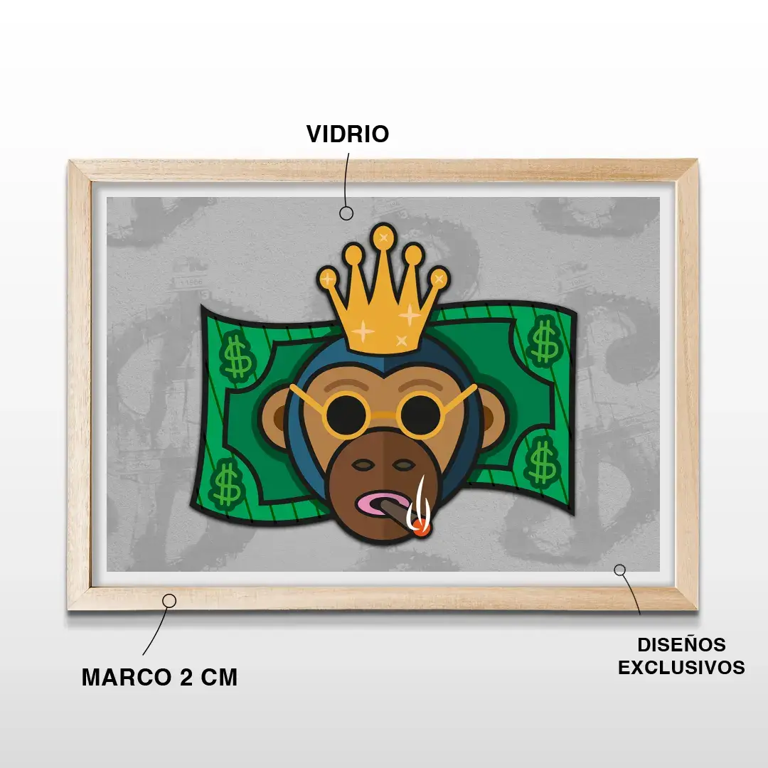 Este cuadro decorativo Mono Dólar combina ironía, ambición y estética pop en una imagen de fuerte impacto visual. La ilustración presenta a un mono con actitud dominante, gafas de sol y expresión confiada, superpuesto sobre un fondo inspirado en el billete de dólar, construyendo una narrativa visual ligada al poder, el dinero y la mentalidad estratégica.