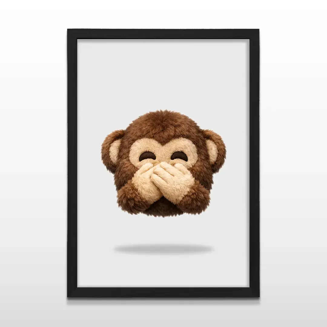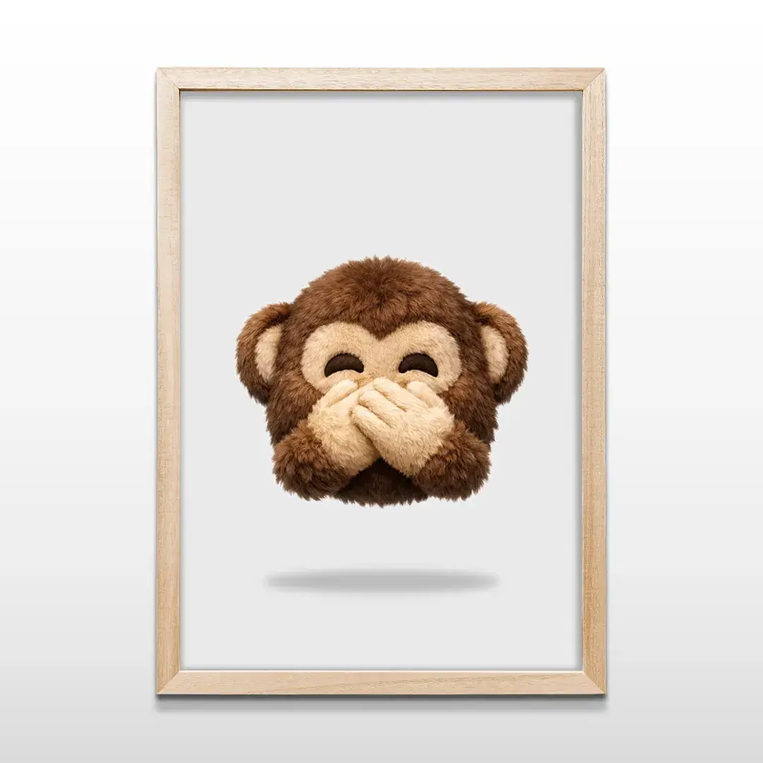 El cuadro decorativo Mono Sabio No Decir es una pieza de arte digital contemporáneo que transmite equilibrio y control emocional a través de una imagen de fuerte impacto sensorial. La composición muestra a un pequeño simio en primer plano, de pelaje ultra detallado y textura suave, cubriendo su boca con un gesto sereno sobre un fondo gris neutro que potencia la pureza visual y el carácter minimalista de la obra.