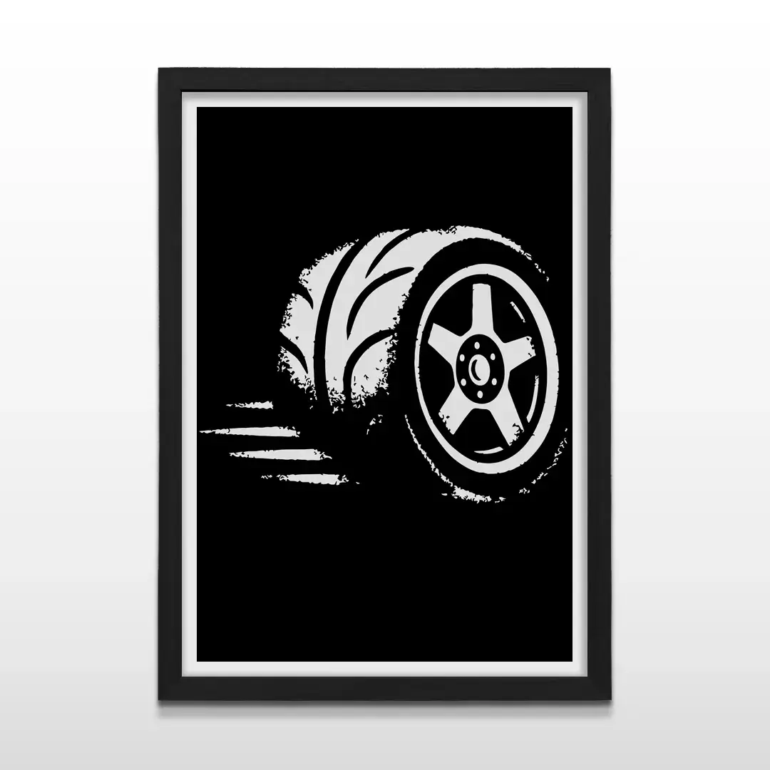 El cuadro decorativo Neumático Carrera sintetiza la cultura del automovilismo en una imagen de alto impacto visual. La obra presenta un neumático de competición trazado en blanco puro sobre un fondo negro profundo, donde las marcas de desgaste y las líneas dinámicas sugieren tracción, velocidad y precisión mecánica. El enfoque minimalista potencia la sensación de movimiento continuo y rendimiento extremo.