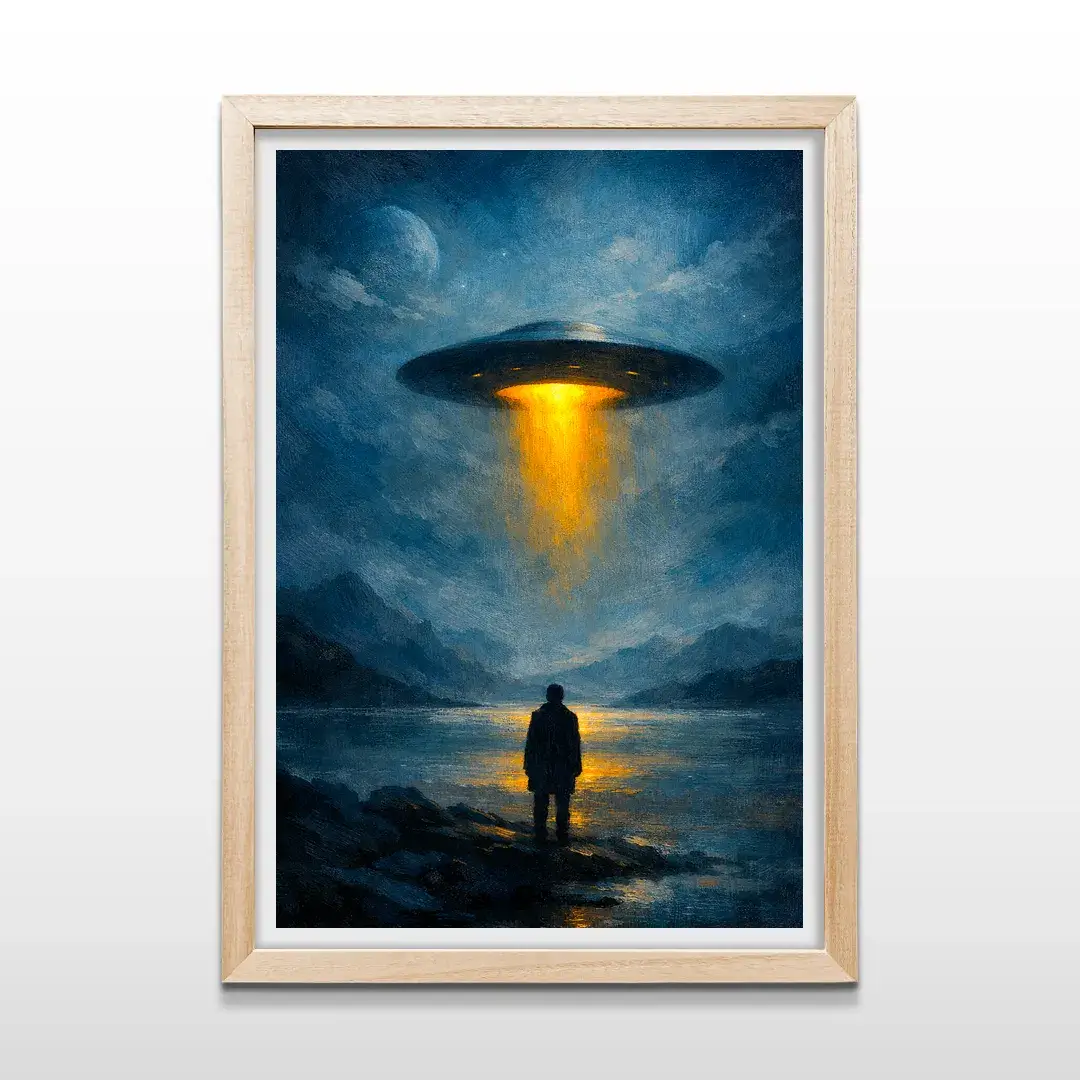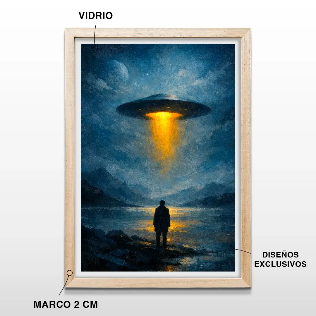 El cuadro decorativo OVNI es una pieza de arte contemporáneo de atmósfera cinematográfica que explora el misterio del universo y el instante exacto del contacto desconocido. La imagen retrata a una figura humana solitaria frente a un lago en calma, mientras una nave extraterrestre desciende desde un cielo nocturno profundo, proyectando un haz de luz dorada que corta la oscuridad y transforma el paisaje en una escena de ciencia ficción elegante y contemplativa.