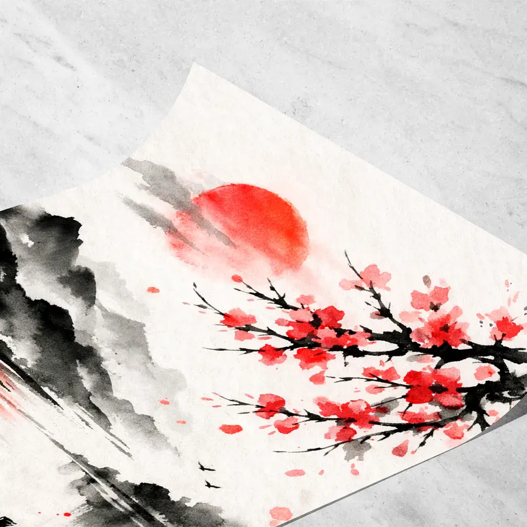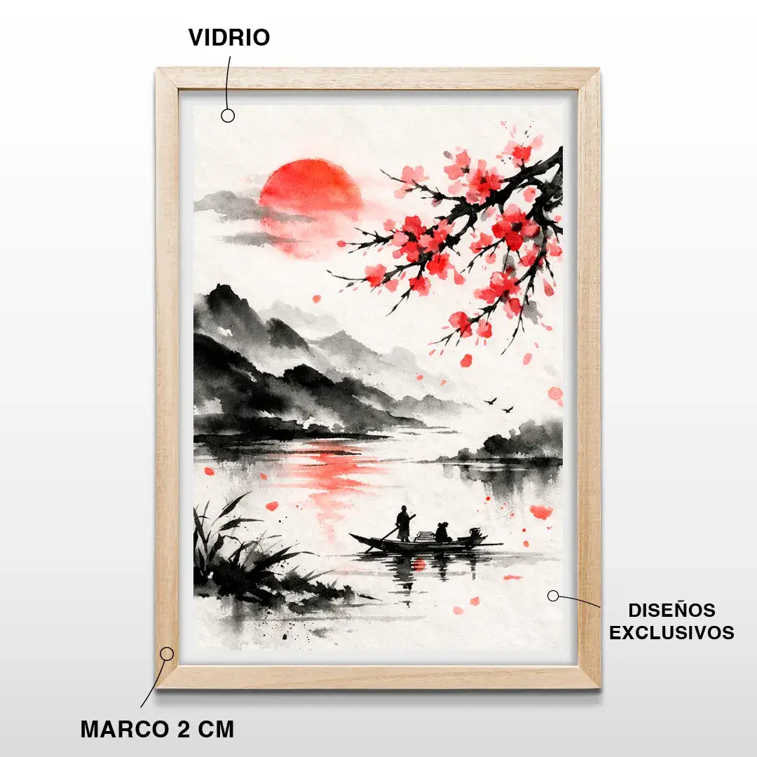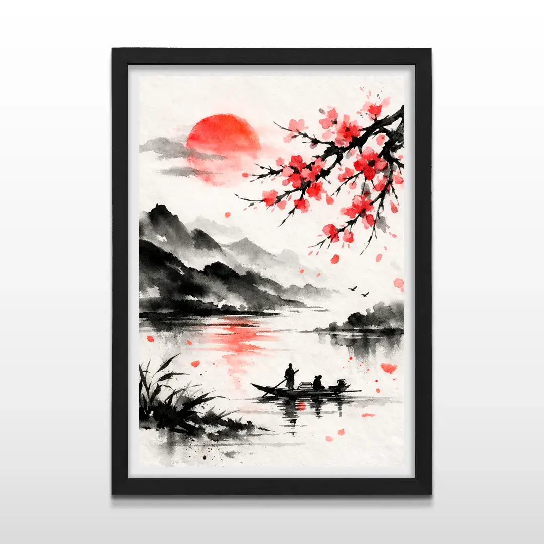 El cuadro decorativo Paisaje Japonés captura la estética contemplativa del arte oriental a través de una escena serena y equilibrada. La ilustración en acuarela presenta un sol rojo profundo descendiendo entre montañas envueltas en neblina, acompañado por una delicada rama de cerezo en flor que se proyecta sobre un río calmo, donde una pequeña embarcación aporta escala y silencio narrativo.