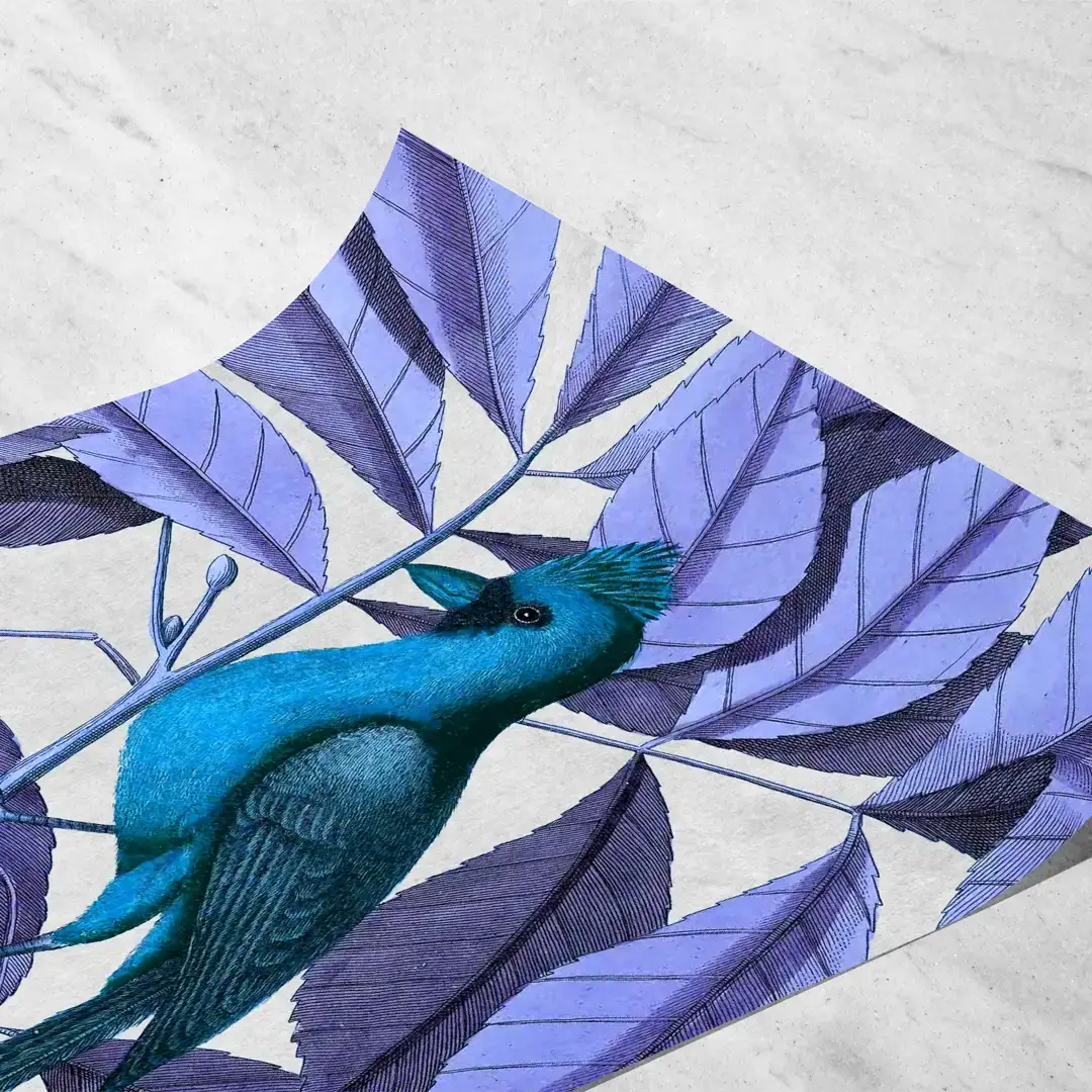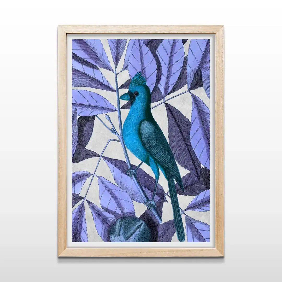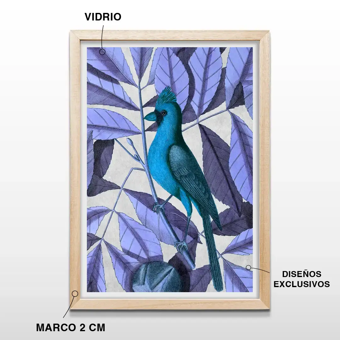 El cuadro decorativo Pájaro exhibe una ilustración artística de ave exótica con plumaje turquesa intenso, posada delicadamente sobre una rama rodeada de follaje en tonos violetas y púrpuras. El contraste cromático y el fondo suavemente texturado realzan cada detalle, logrando una escena de inspiración natural con fuerte impacto visual.