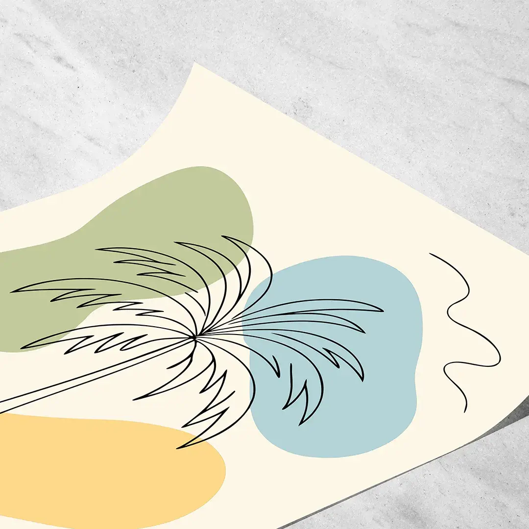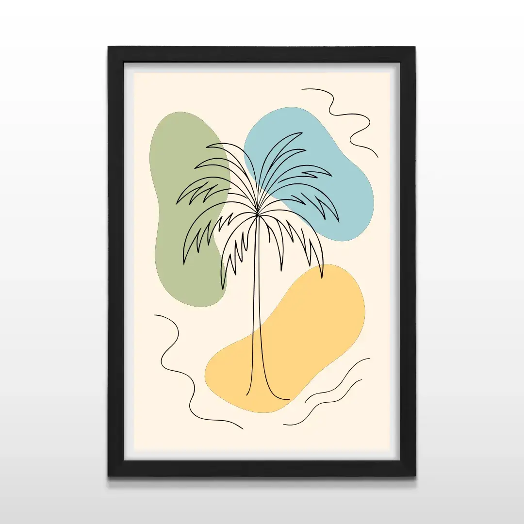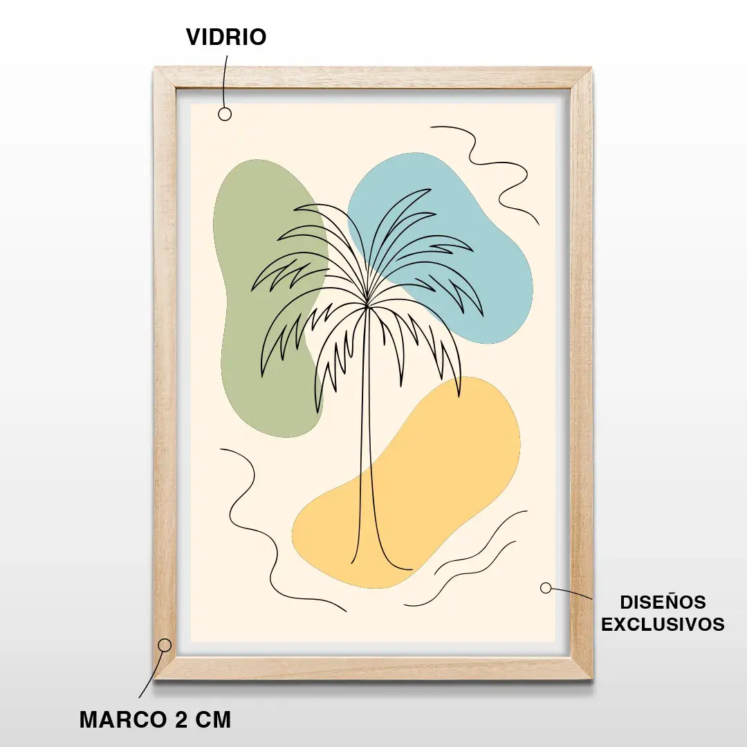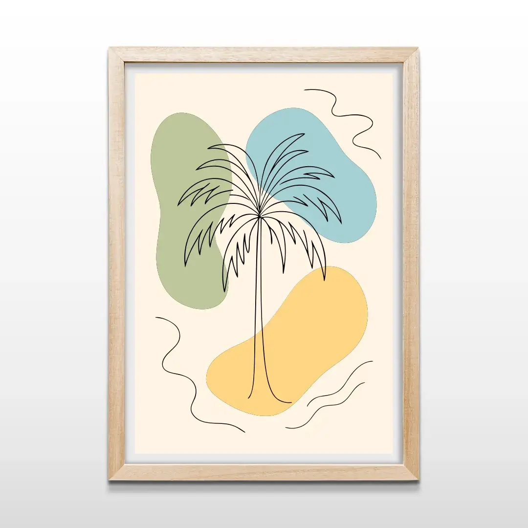 El cuadro decorativo Palmera transmite una sensación inmediata de calma visual y conexión con lo natural. Su diseño minimalista de líneas suaves y formas orgánicas interpreta la silueta tropical desde una estética contemporánea, combinando tonos pasteles y tierras que evocan luz, aire y descanso.