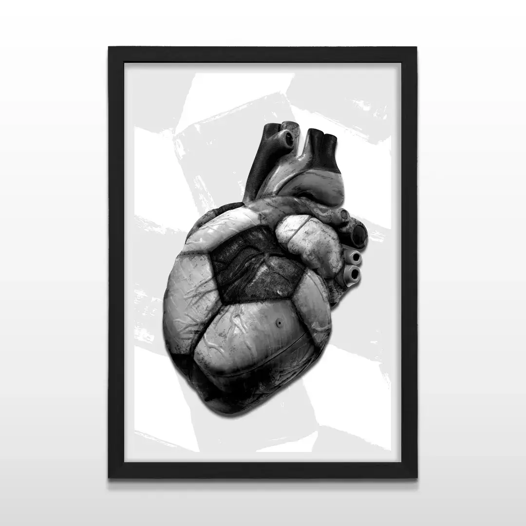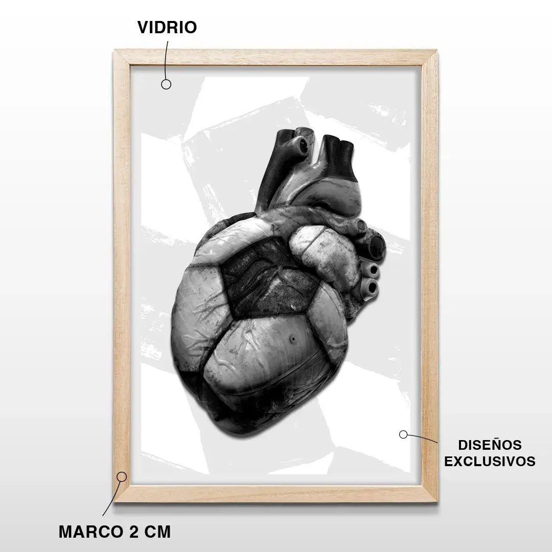 El cuadro decorativo Pasión Fútbol es una pieza de arte contemporáneo de fuerte carga emocional que representa el vínculo visceral entre el hincha y el juego. La imagen muestra un corazón humano hiperrealista integrado con las costuras y la textura de una pelota de fútbol clásica, logrando una fusión visual impactante en una composición monocromática de alto contraste sobre fondo blanco, limpia y expresiva.