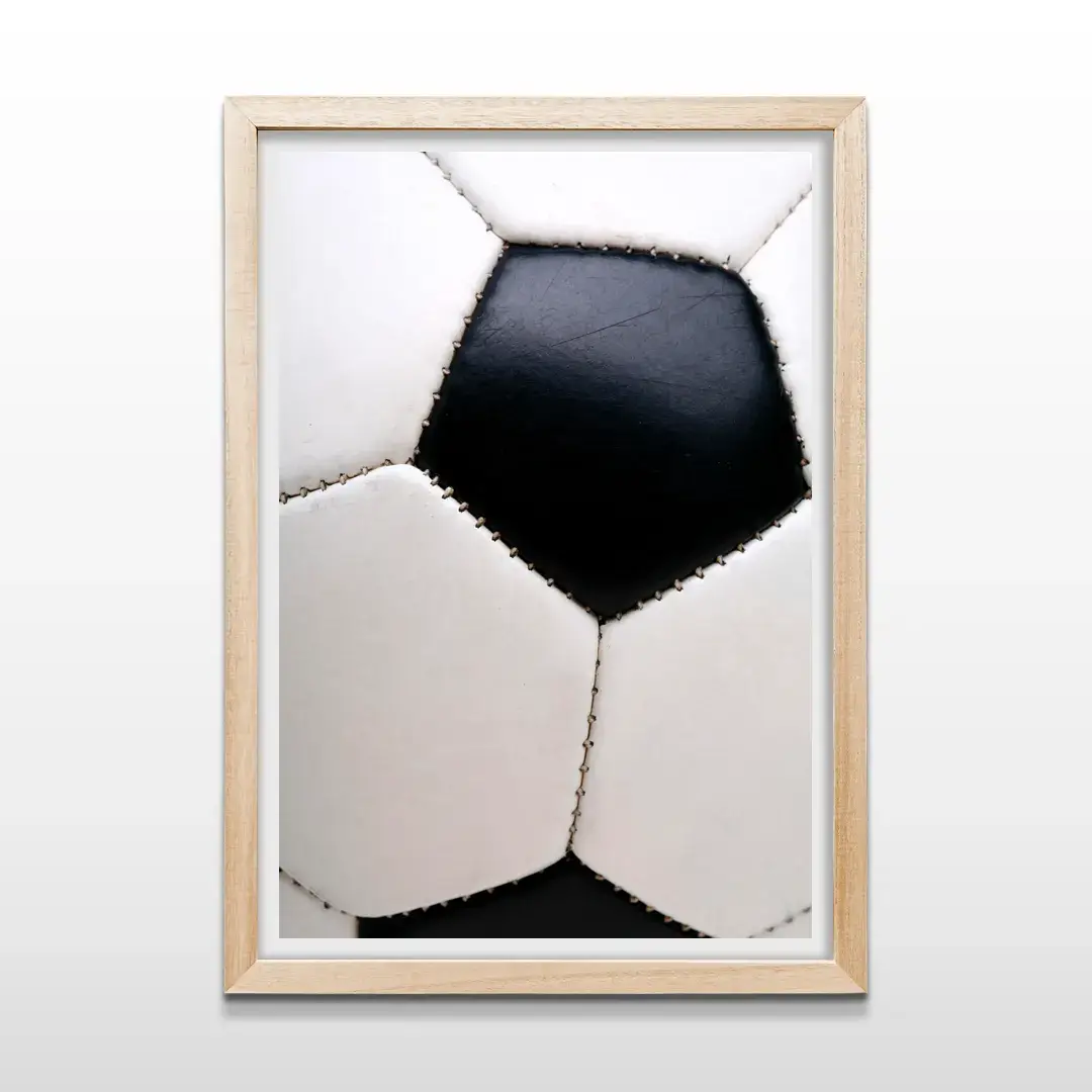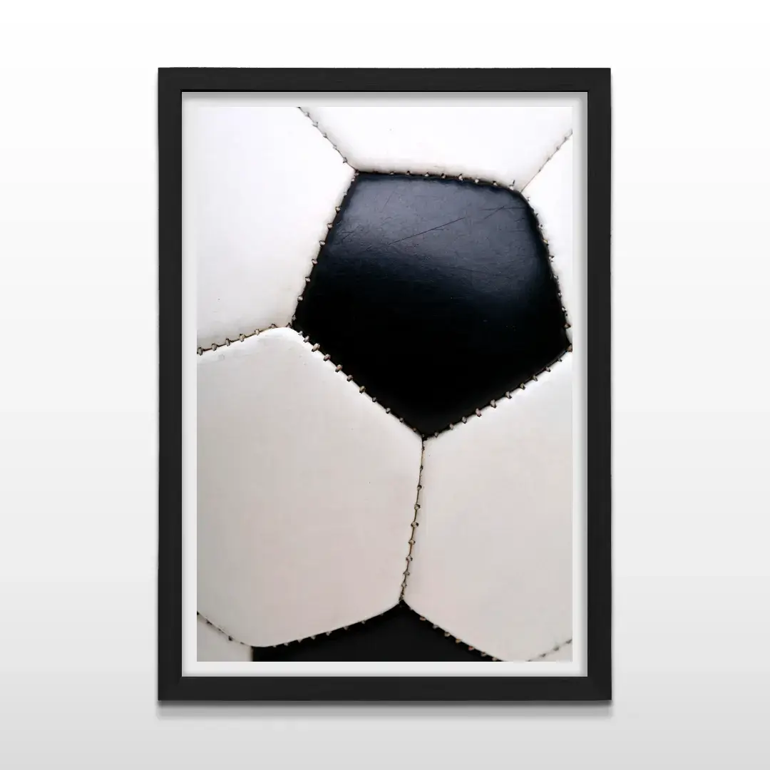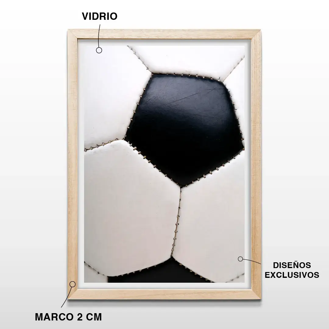 Este cuadro decorativo de pelota de fútbol presenta una mirada cercana y precisa sobre el objeto que define al juego. La composición trabaja el detalle macro de los gajos y las costuras, construyendo una imagen equilibrada donde la geometría y la textura del balón se convierten en protagonistas absolutos.