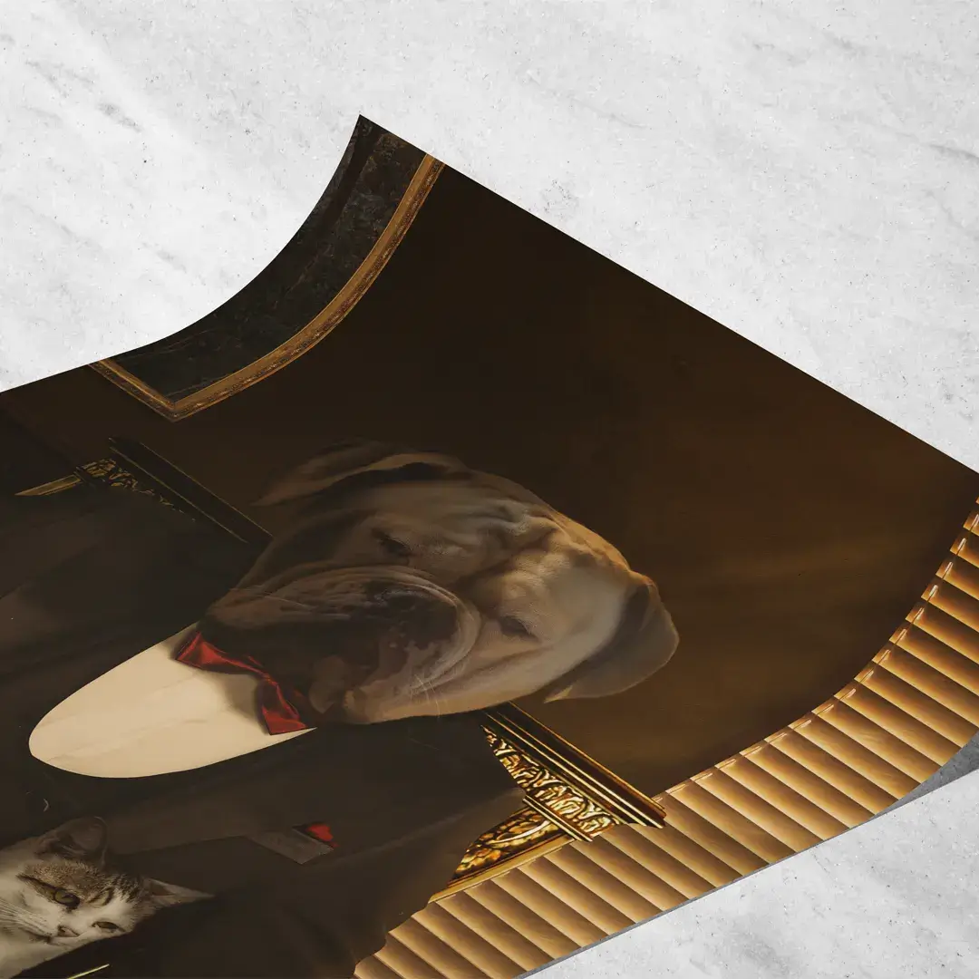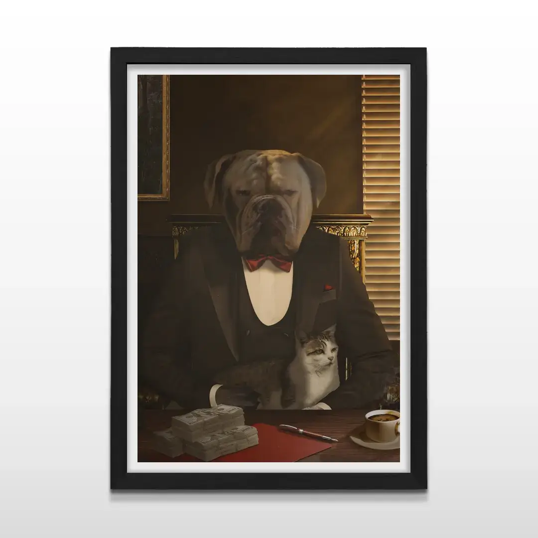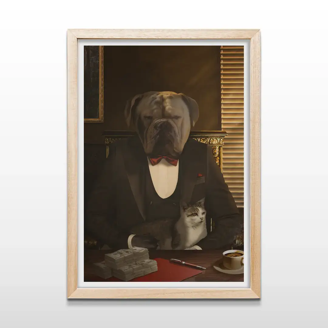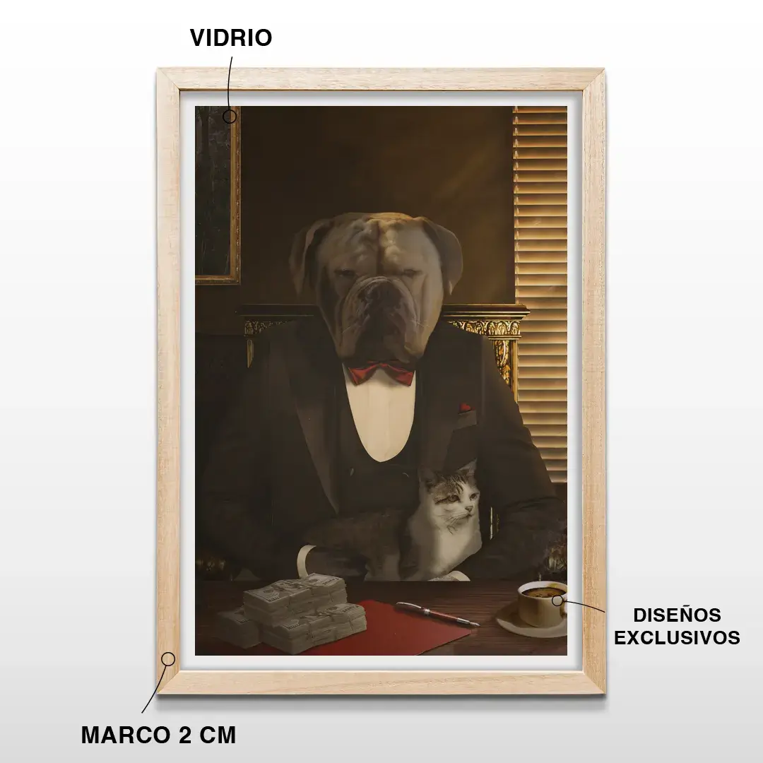 El cuadro decorativo Perro Don Vito es una ilustración artística de estilo narrativo que reinterpreta con ironía y elegancia el universo del cine mafioso clásico. La escena presenta a un bulldog de porte imponente caracterizado como un patriarca del poder, con esmoquin oscuro, expresión serena y un gato en brazos, acompañado por un escritorio cubierto de billetes que refuerza el clima de control absoluto y jerarquía silenciosa.