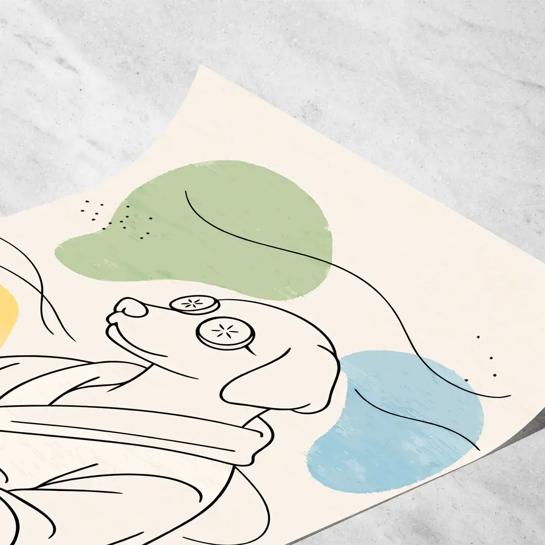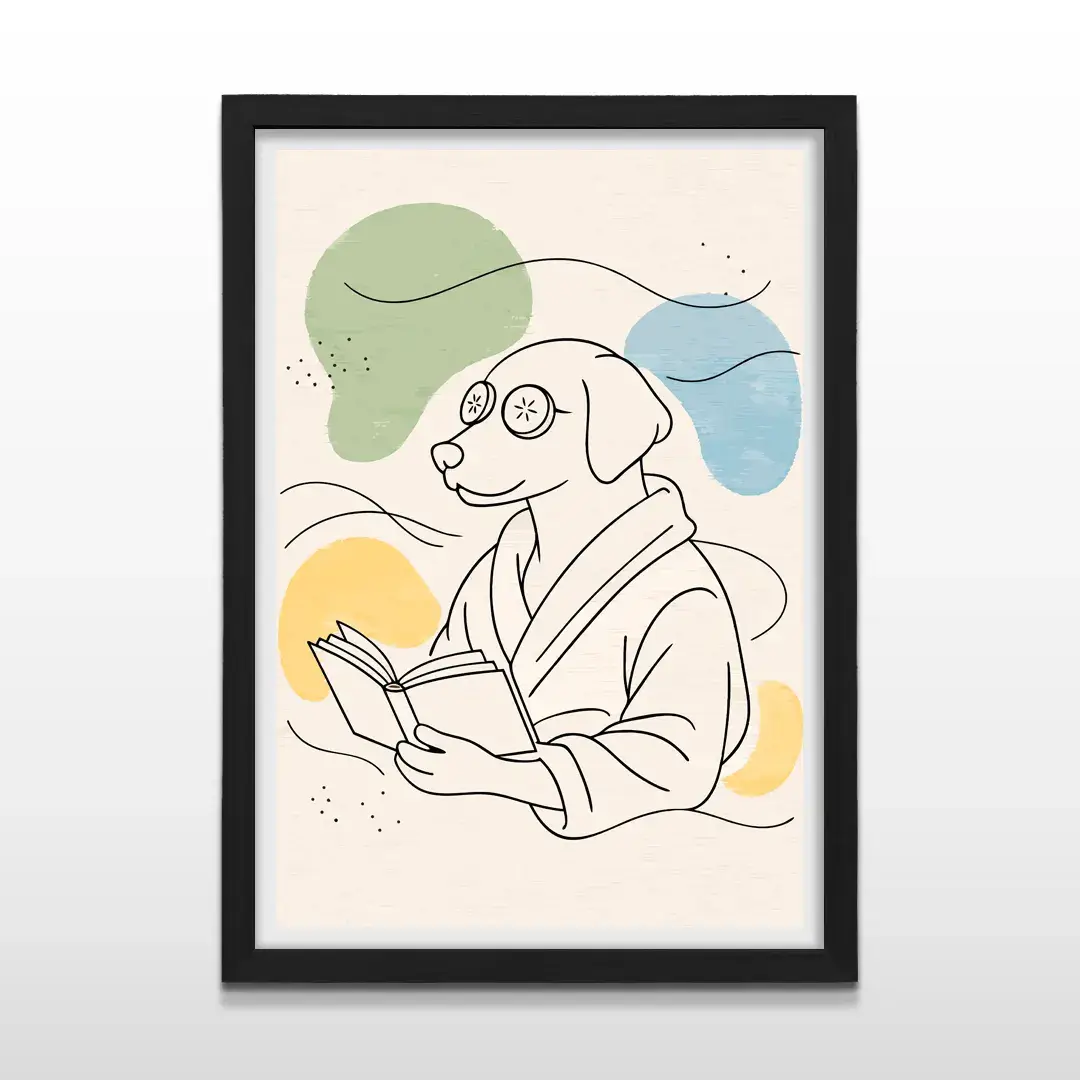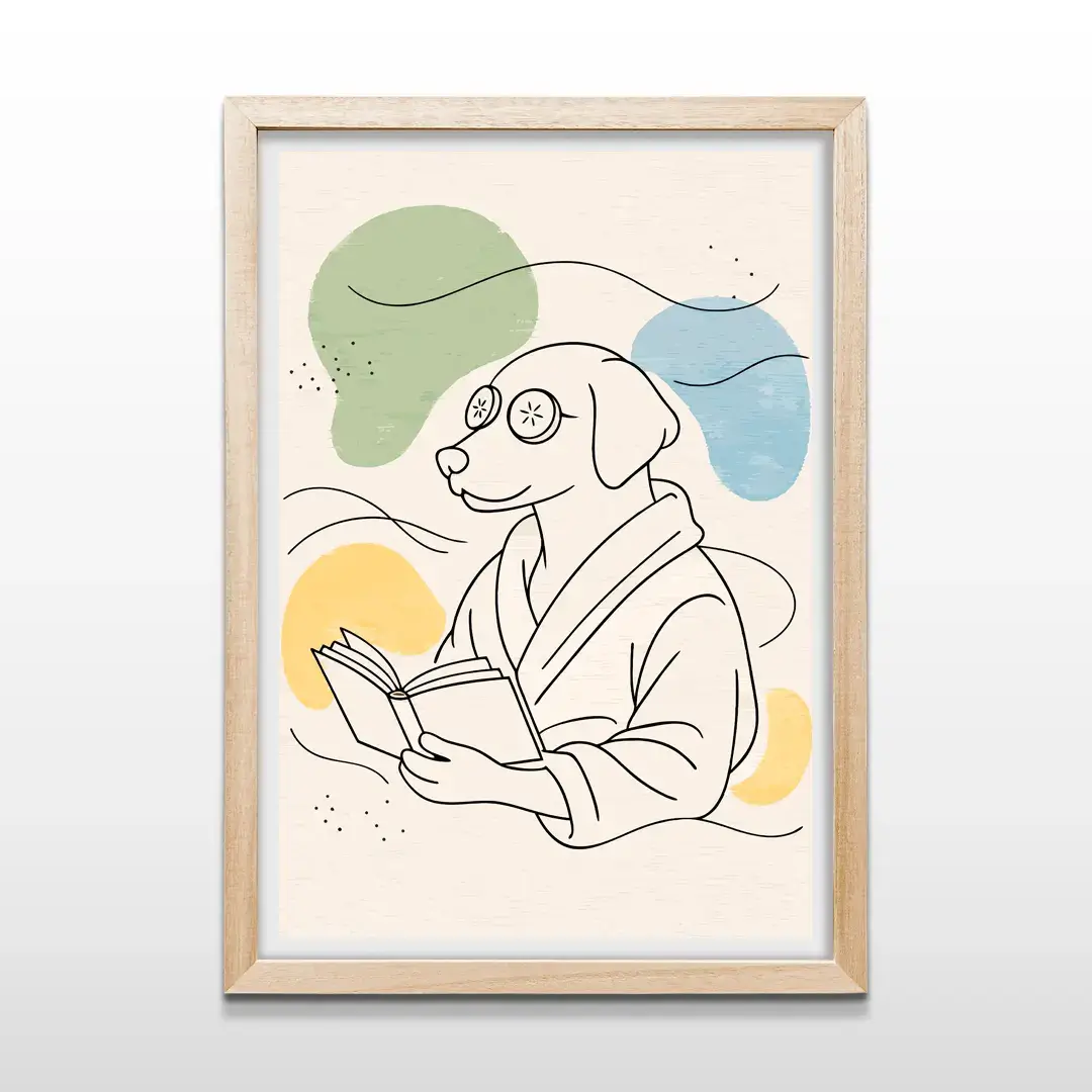 El cuadro decorativo Perro Spa propone una escena de relajación absoluta con un enfoque moderno, simpático y cuidadosamente equilibrado. La ilustración muestra un perro en pleno ritual de descanso, con rodajas de pepino sobre los ojos y bata de baño, resuelta con trazo lineal limpio y una paleta de tonos pastel verde, celeste y amarillo que descansan sobre un fondo crema suave.