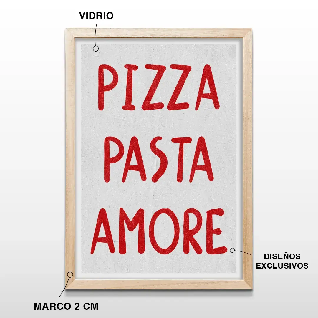 Pensado para quienes desean comprar cuadros decorativos de cocina en Argentina, este diseño se relaciona con búsquedas como cuadro Pizza Pasta Amore decoración, lámina tipográfica para cocina, arte gastronómico italiano para comedor, cuadro frase italiana de cocina y decoración culinaria moderna para pared.