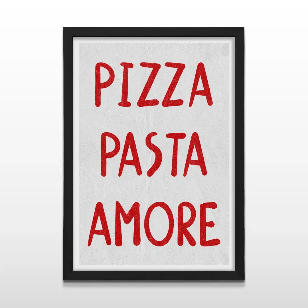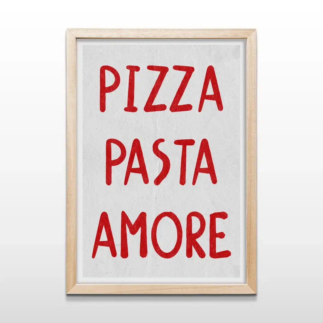 El cuadro decorativo Pizza Pasta Amore presenta una composición tipográfica directa y expresiva donde la frase se convierte en el centro del diseño. La tipografía de estilo moderno con carácter artesanal aparece en un rojo vibrante que resalta con fuerza sobre un fondo blanco limpio, generando una estética simple pero llena de personalidad.