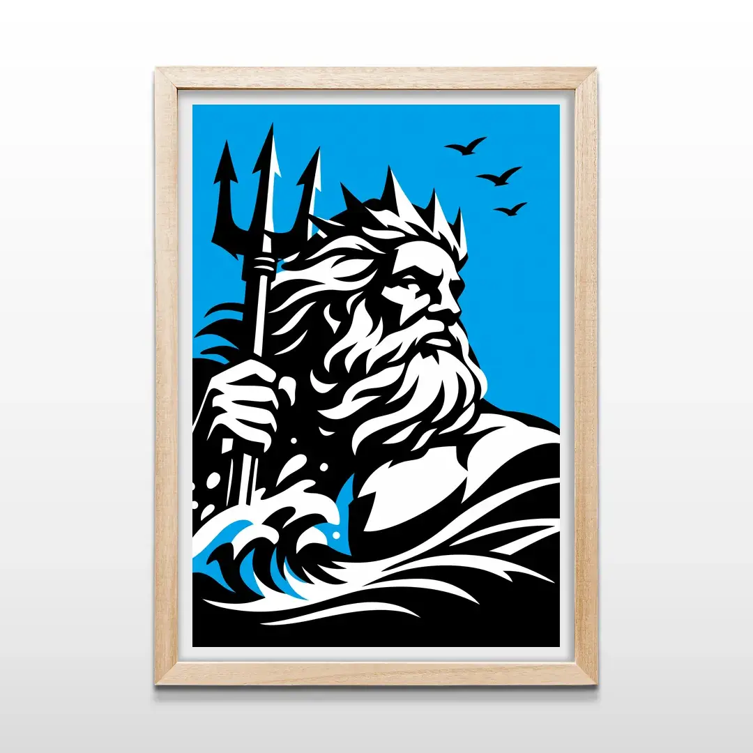 El cuadro decorativo Poseidón es una obra de arte contemporánea que captura el poder y la autoridad del dios de los mares. Presenta un retrato estilizado en alto contraste blanco y negro, con su tridente emergiendo entre olas impetuosas sobre un fondo azul profundo, evocando fuerza, resiliencia y liderazgo mitológico.