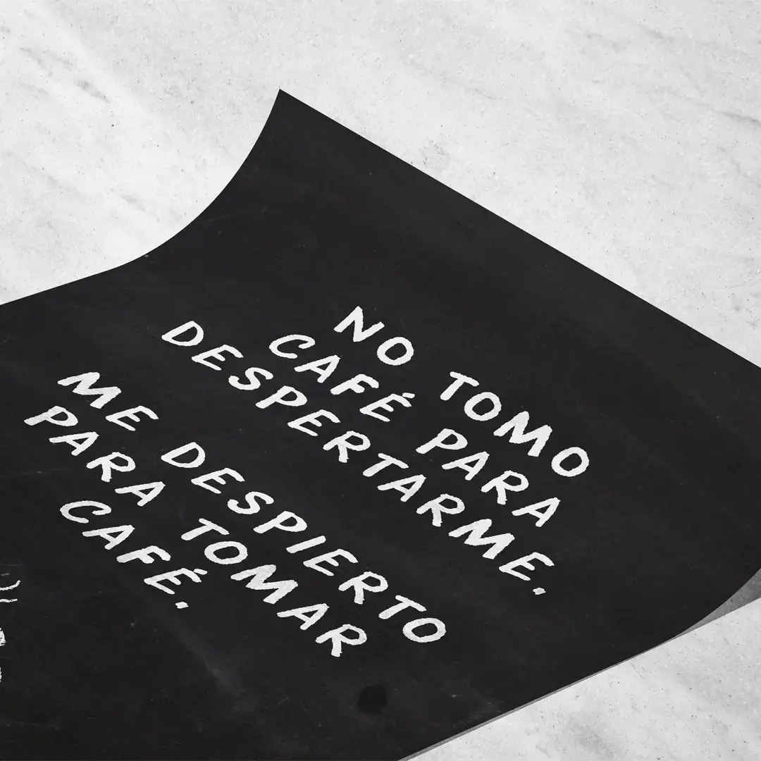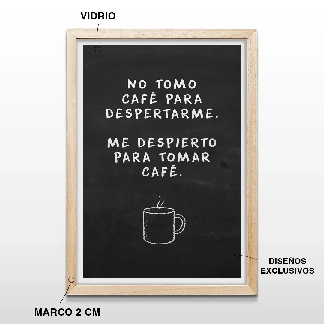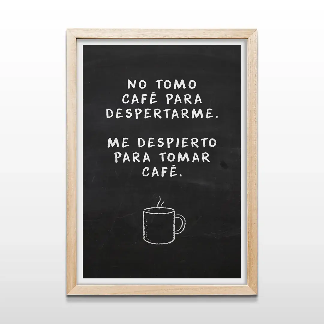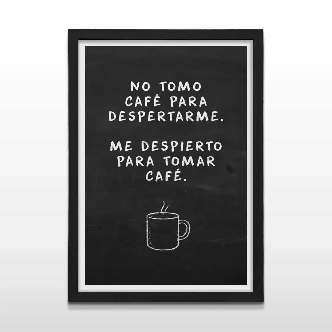 El cuadro decorativo Primer Café convierte el ritual matutino en una declaración de identidad. Con estética de pizarra minimalista y tipografía manual en blanco sobre fondo negro, la frase “No tomo café para despertarme, me despierto para tomar café” se convierte en protagonista, acompañada por la silueta sutil de una taza humeante que aporta equilibrio visual.