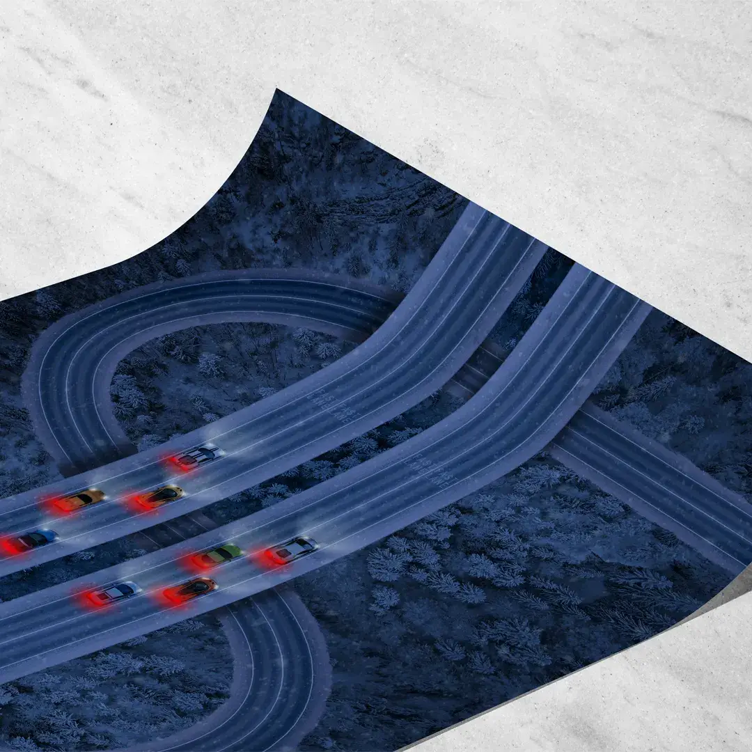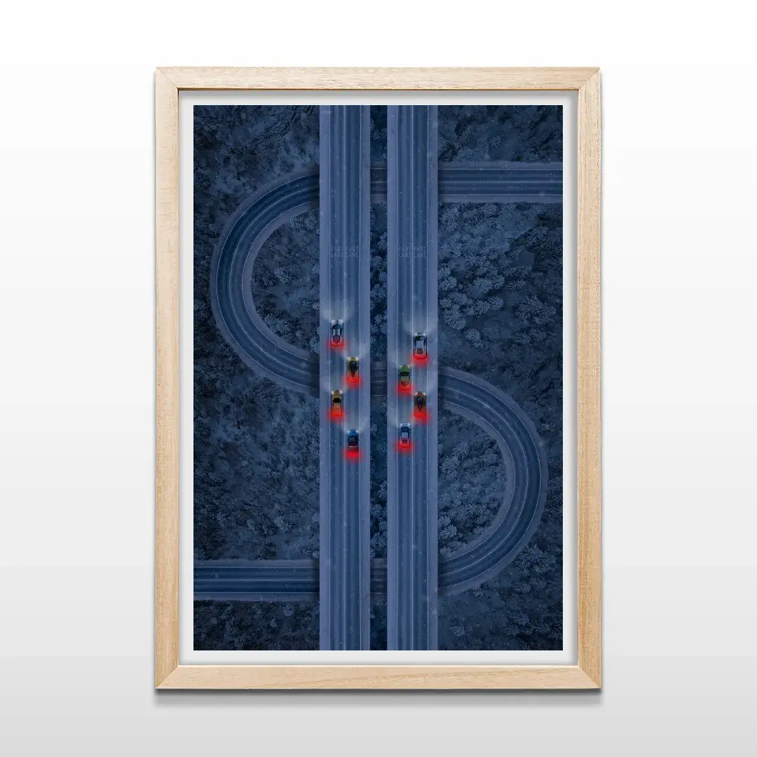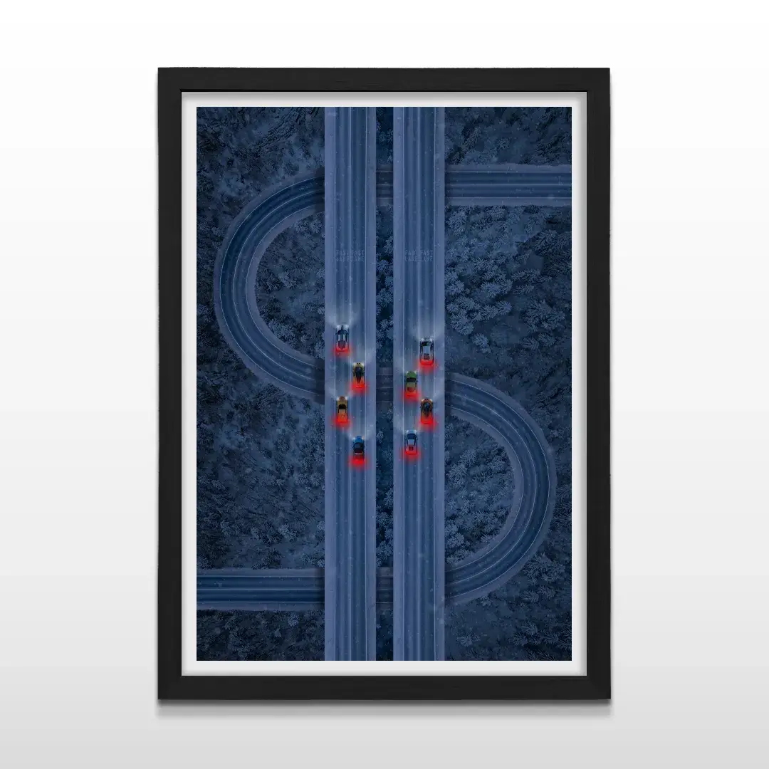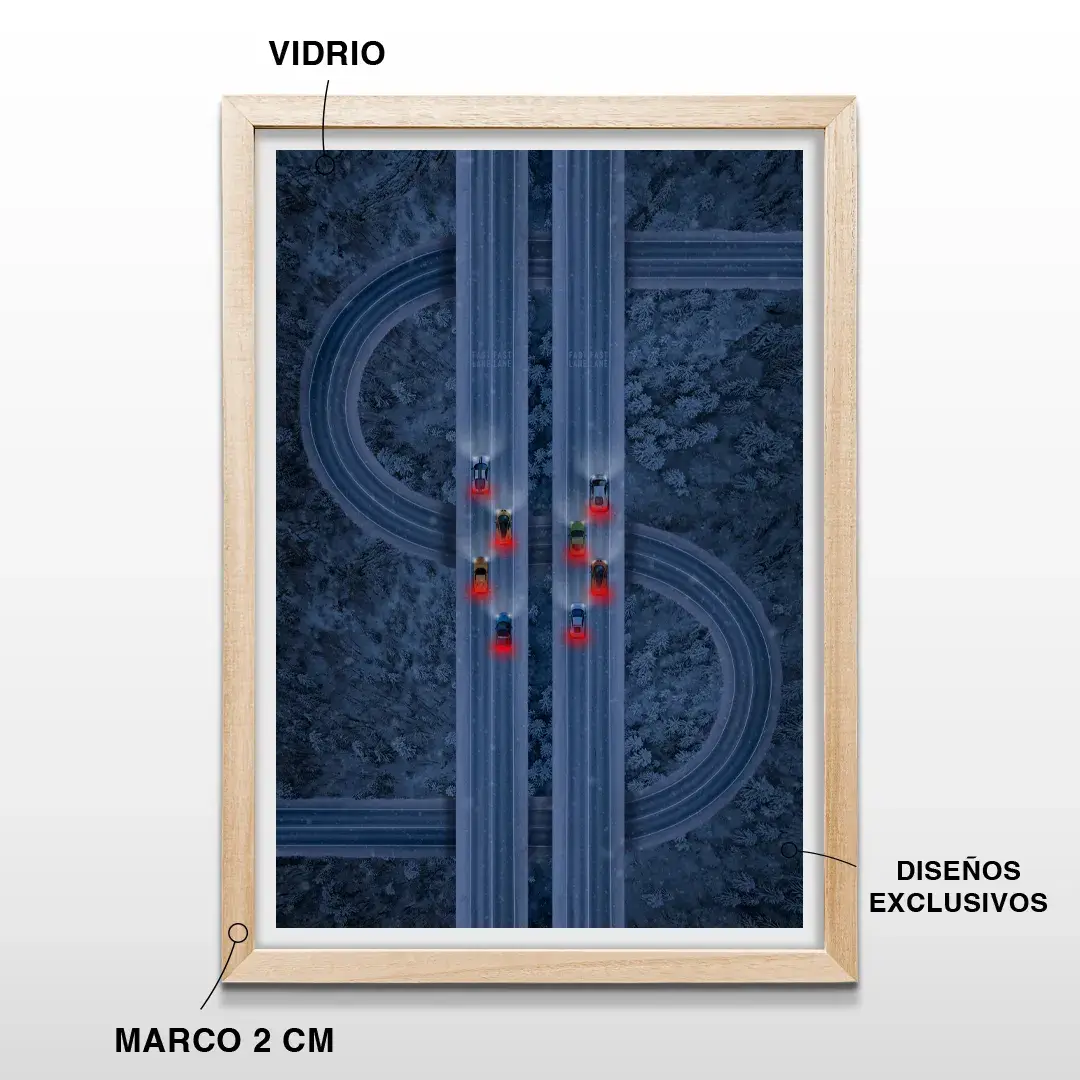 El cuadro decorativo Ruta del Dinero es una obra de arte digital contemporánea que representa el avance constante hacia el éxito financiero a través de una composición visual potente y simbólica. La escena muestra una vista aérea nocturna de autopistas de alta montaña que se entrelazan con precisión para formar la silueta de un signo de dólar, atravesadas por estelas de luz de autos deportivos que recorren el camino a gran velocidad entre un bosque profundo.