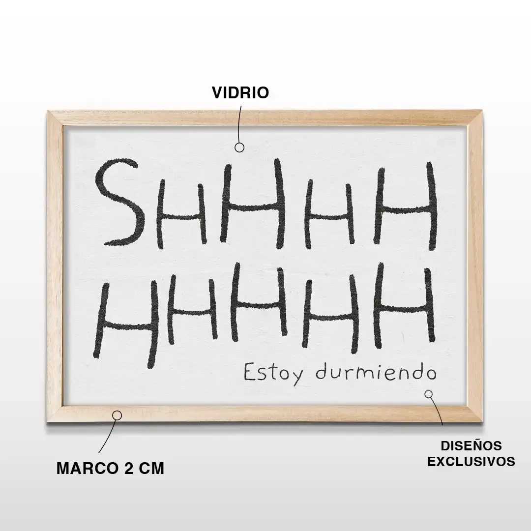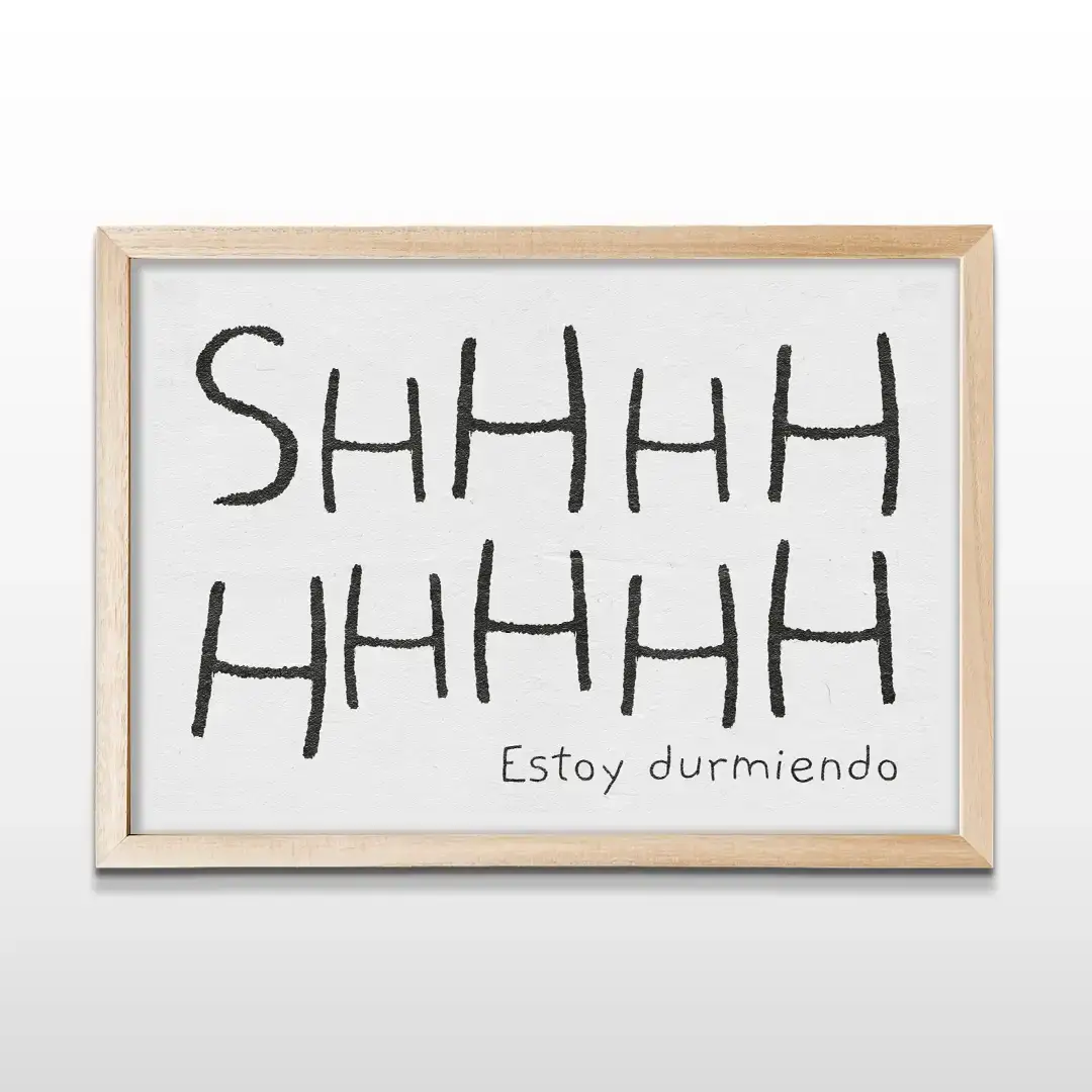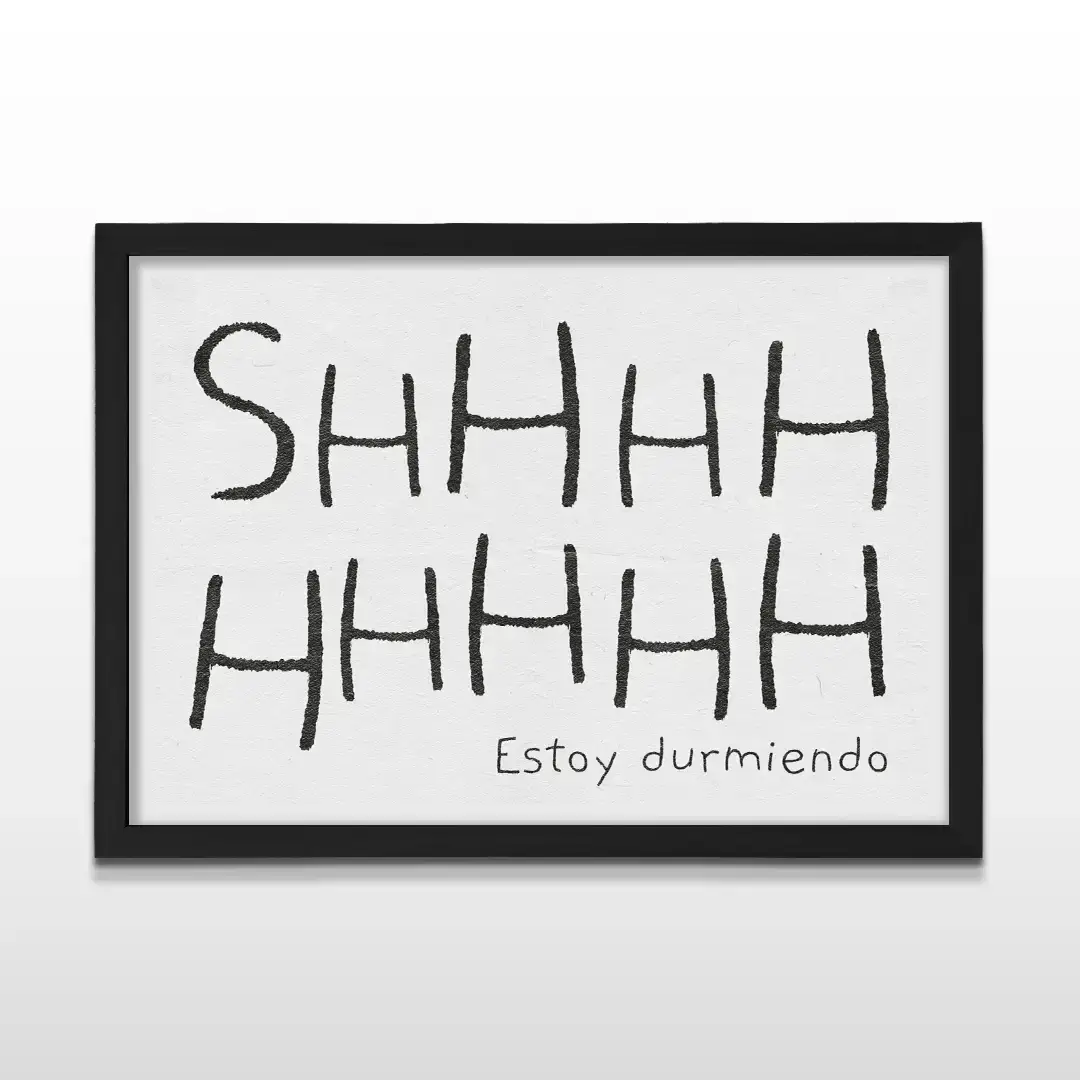 El cuadro decorativo Sh! Estoy Durmiendo plantea una propuesta tipográfica directa con un guiño sutil al descanso y la privacidad. La frase se presenta en negro sobre fondo blanco, logrando un contraste limpio propio del arte tipográfico minimalista, donde el mensaje se convierte en el foco absoluto de la composición.