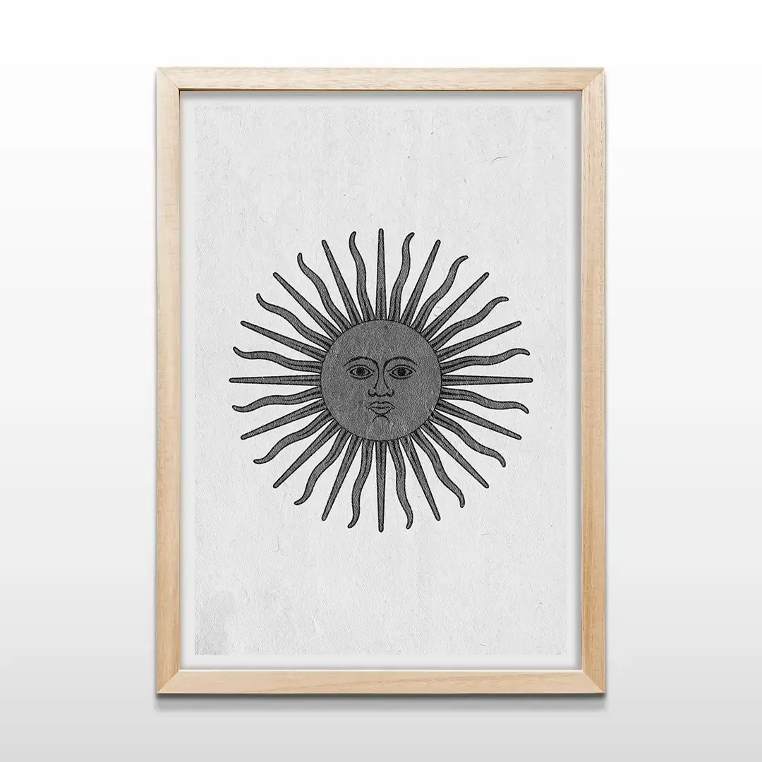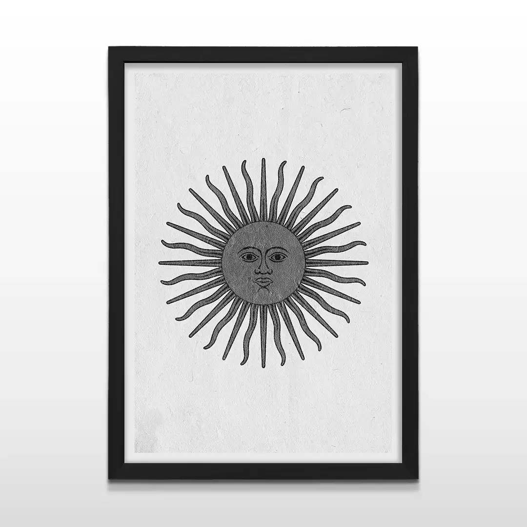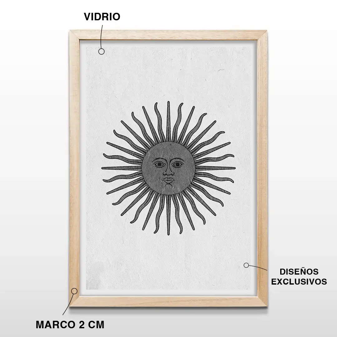 La estética se apoya en el diseño gráfico minimalista, donde la síntesis de formas permite destacar el símbolo sin distracciones. Este enfoque convierte al clásico sol patrio en una pieza moderna, alineada con tendencias de decoración contemporánea en blanco y negro y arte simbólico para interiores.