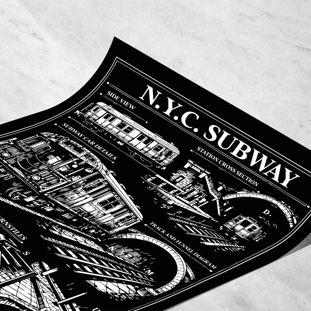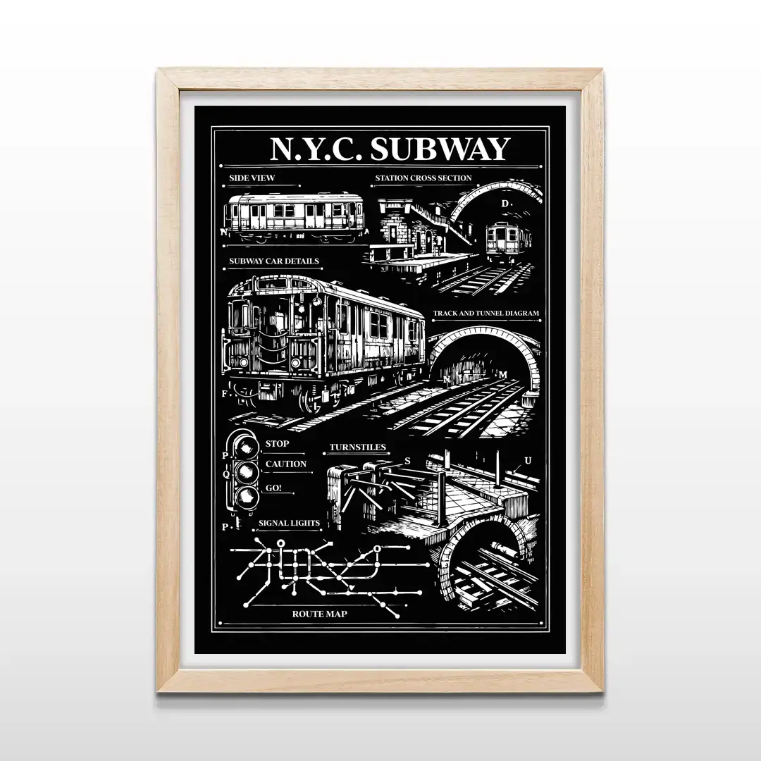 El cuadro decorativo Subway New York presenta una composición gráfica en blanco sobre fondo negro que reúne planos técnicos de vagones, cortes estructurales de estaciones, diagramas de túneles y mapa histórico de rutas del metro neoyorquino. Una pieza que captura la ingeniería urbana con un enfoque visual de alto contraste y precisión técnica.