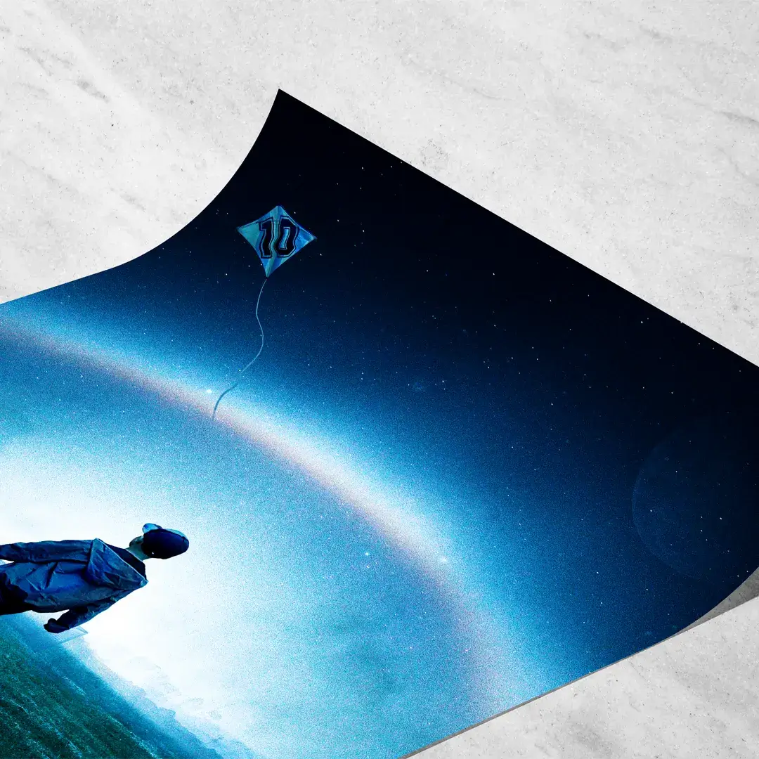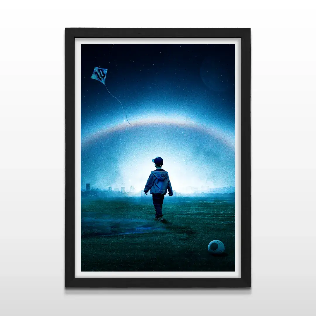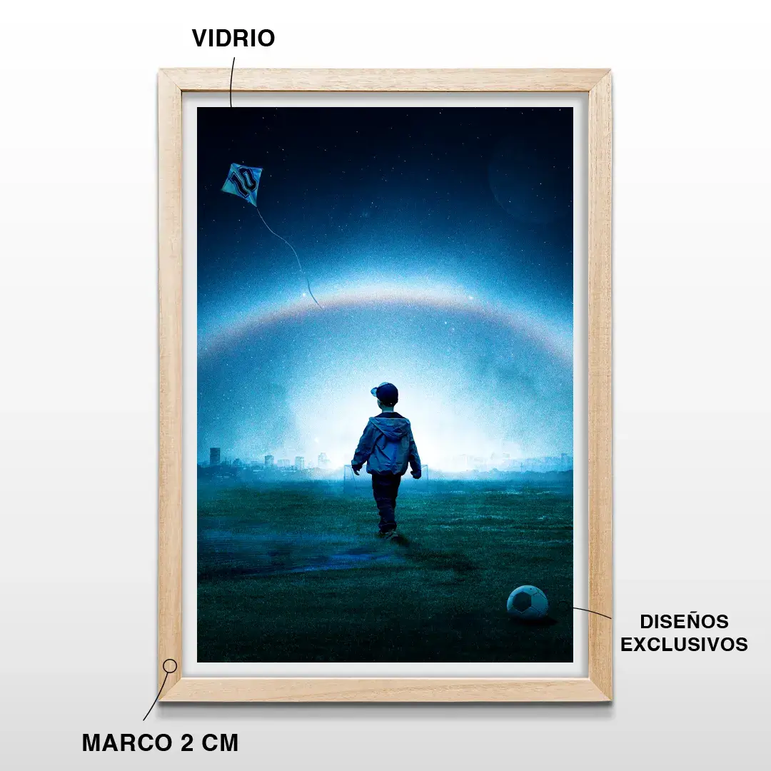 El cuadro decorativo Sueño de Gloria es una obra de arte conceptual argentino que celebra la pasión por el fútbol y los sueños de la infancia. Presenta la silueta de un niño caminando solo por un potrero místico bajo un cielo estrellado iluminado por un arcoíris nocturno, mientras observa un barrilete con el número 10 que vuela alto hacia el infinito.