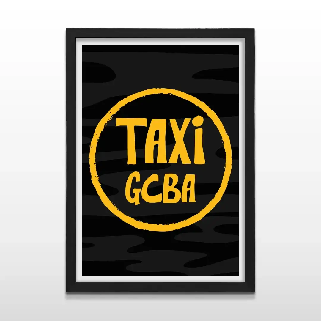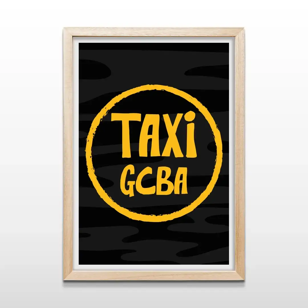 El cuadro decorativo Taxi De La Ciudad reproduce el emblema oficial “TAXI GCBA” en su clásico círculo amarillo, destacado sobre un fondo negro con sutiles reflejos urbanos en escala de grises. La combinación de alto contraste y estética pop genera una imagen directa, reconocible y cargada de identidad porteña.