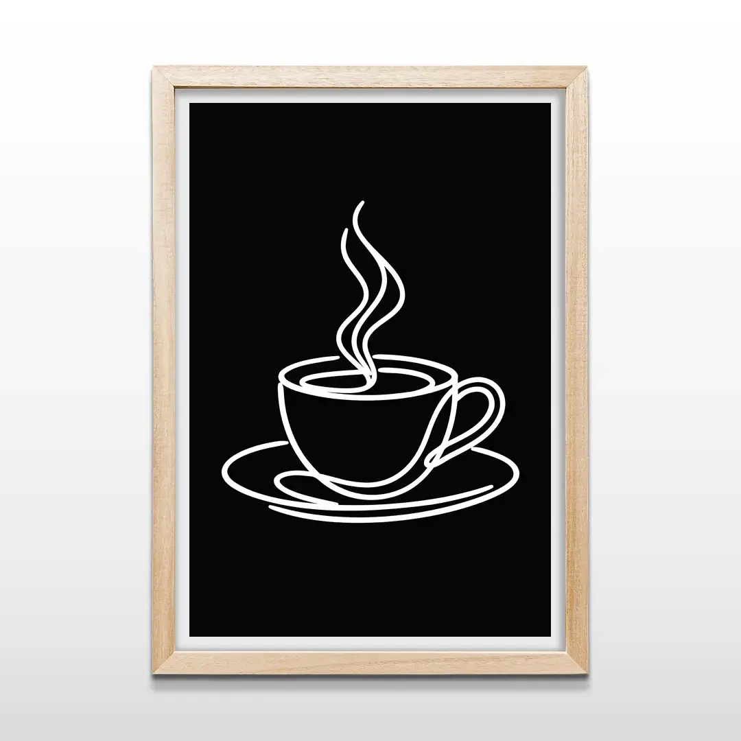 Este cuadro decorativo de taza de café traduce un ritual cotidiano en una imagen de máxima síntesis visual. La ilustración de línea continua define la silueta de la taza con un trazo fluido y preciso, destacándose sobre un fondo negro profundo que potencia el contraste y refuerza la sensación de recogimiento y pausa.