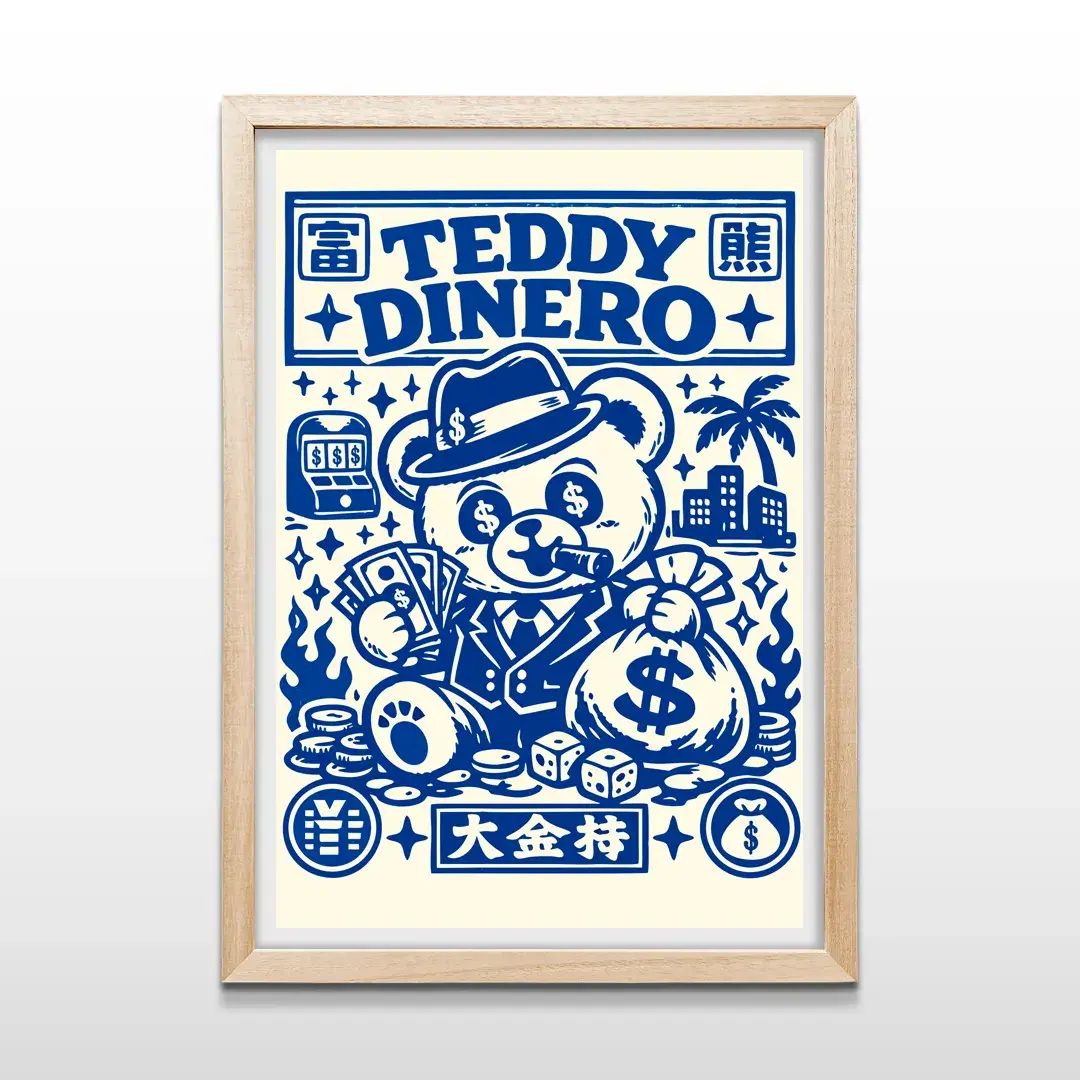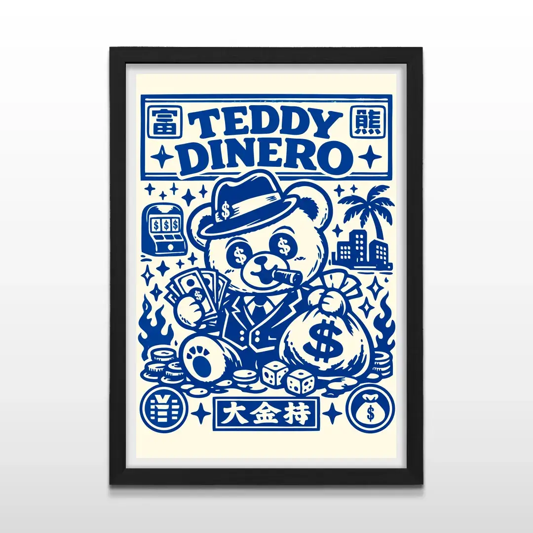 El cuadro decorativo Teddy Dinero es una obra de arte moderna y disruptiva que mezcla humor, lujo y cultura pop. Presenta a un osito de peluche con estilo gánster: traje impecable, habano y rodeado de bolsas de dinero, dados y símbolos de estatus, todo en un diseño bitono azul profundo y crema que remite a la estética vintage de casinos y cartelería retro.